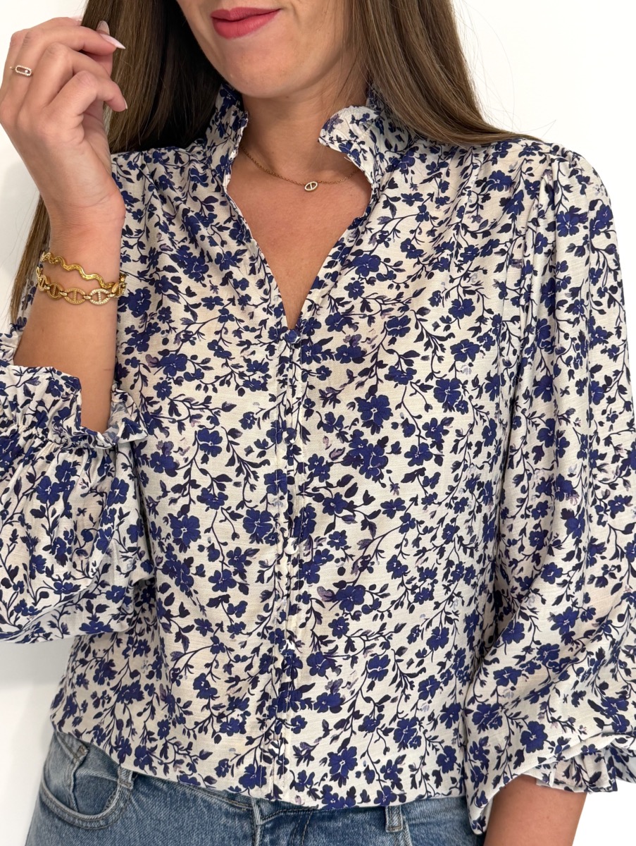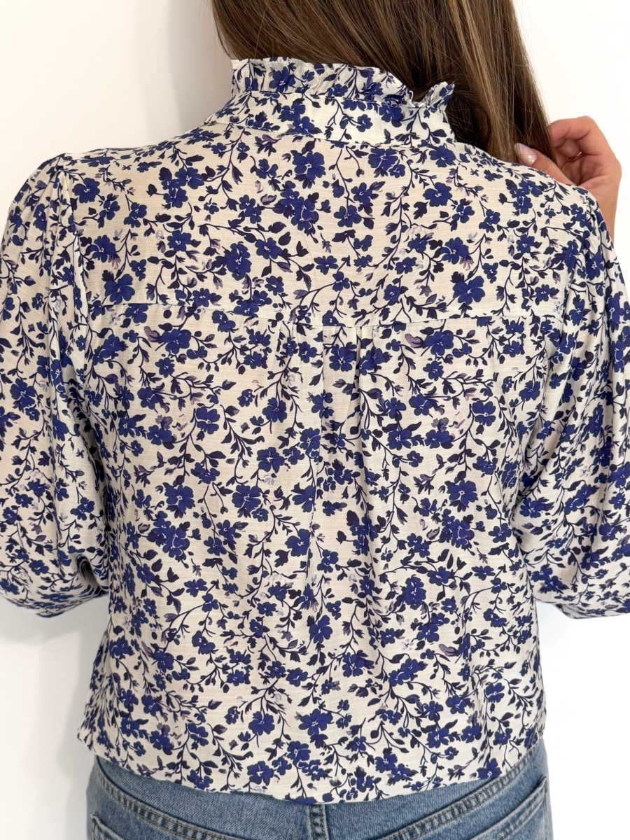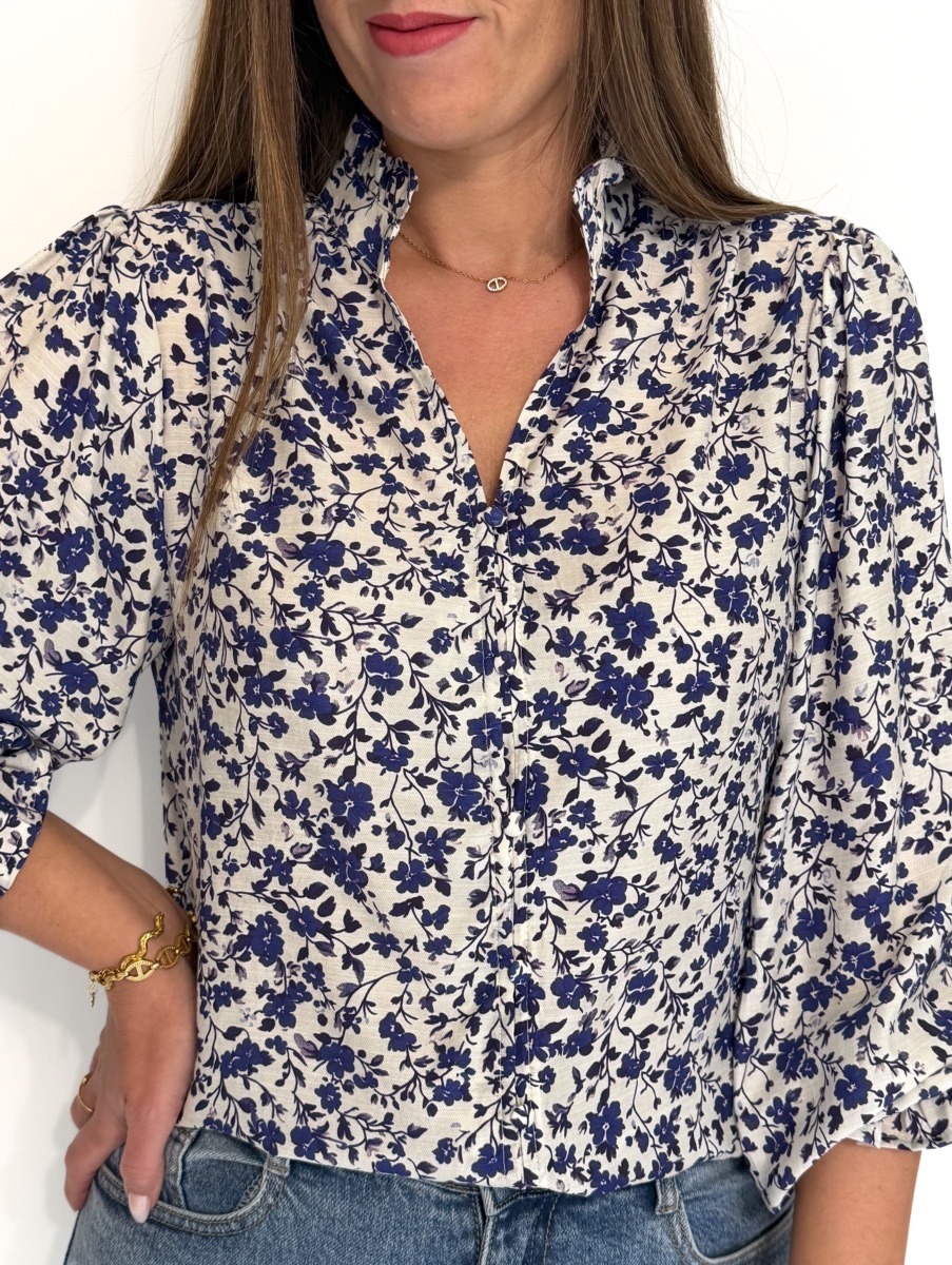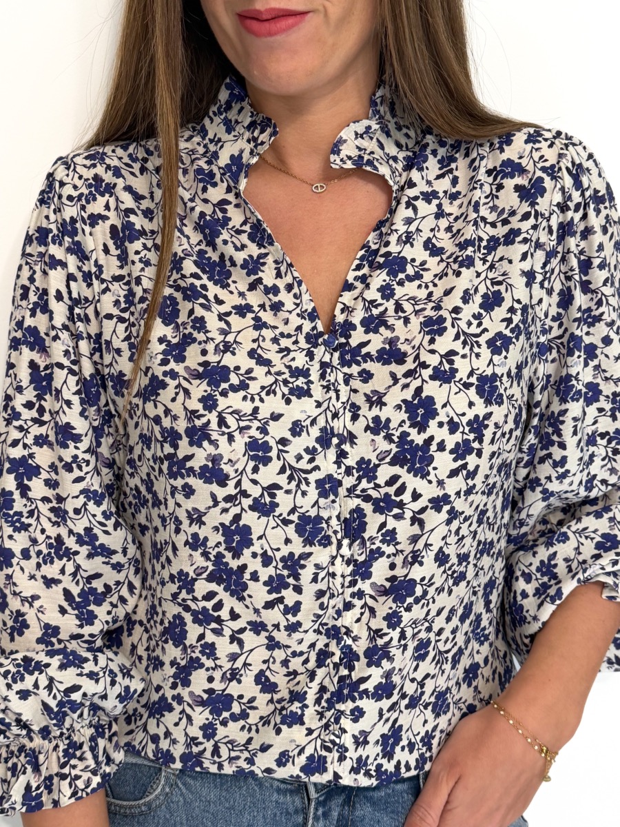 Blouse écrue parsemée de motifs bleus.