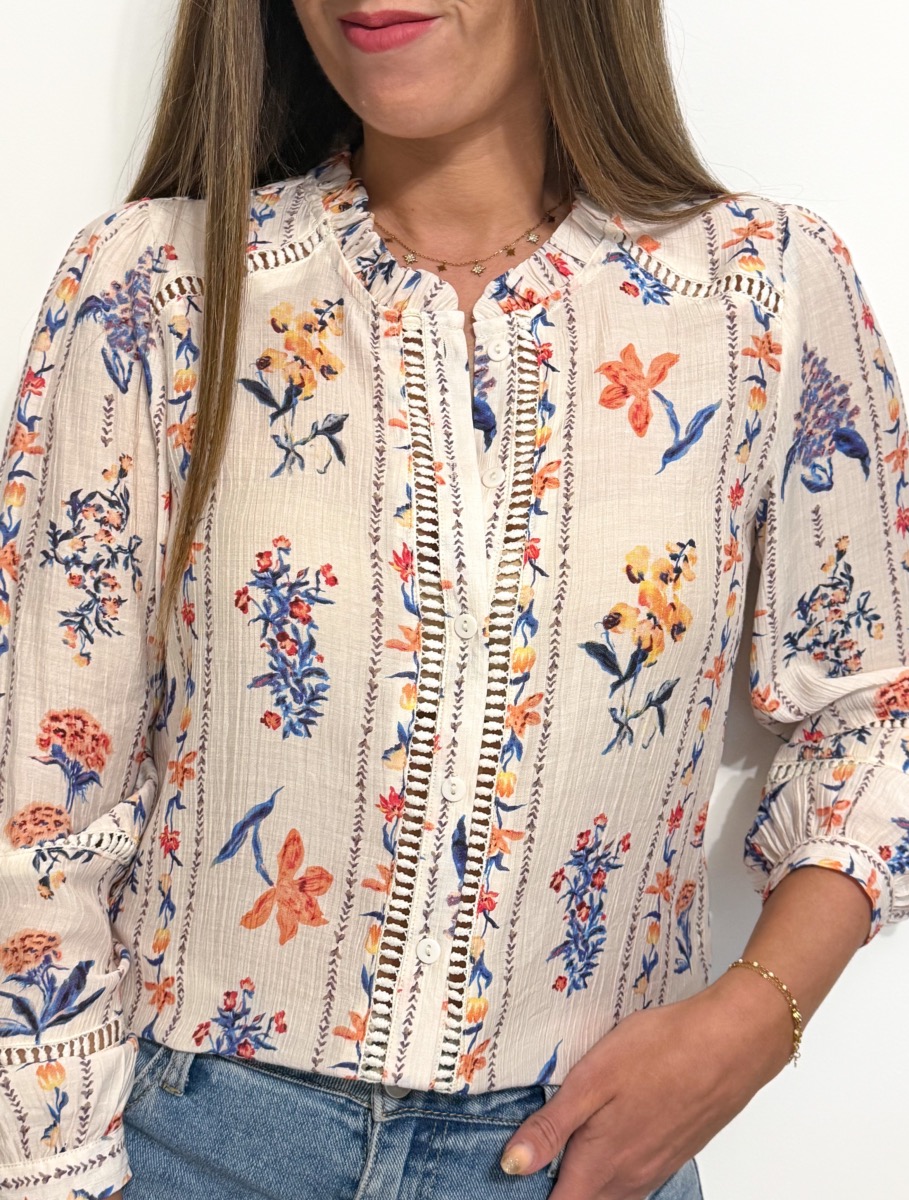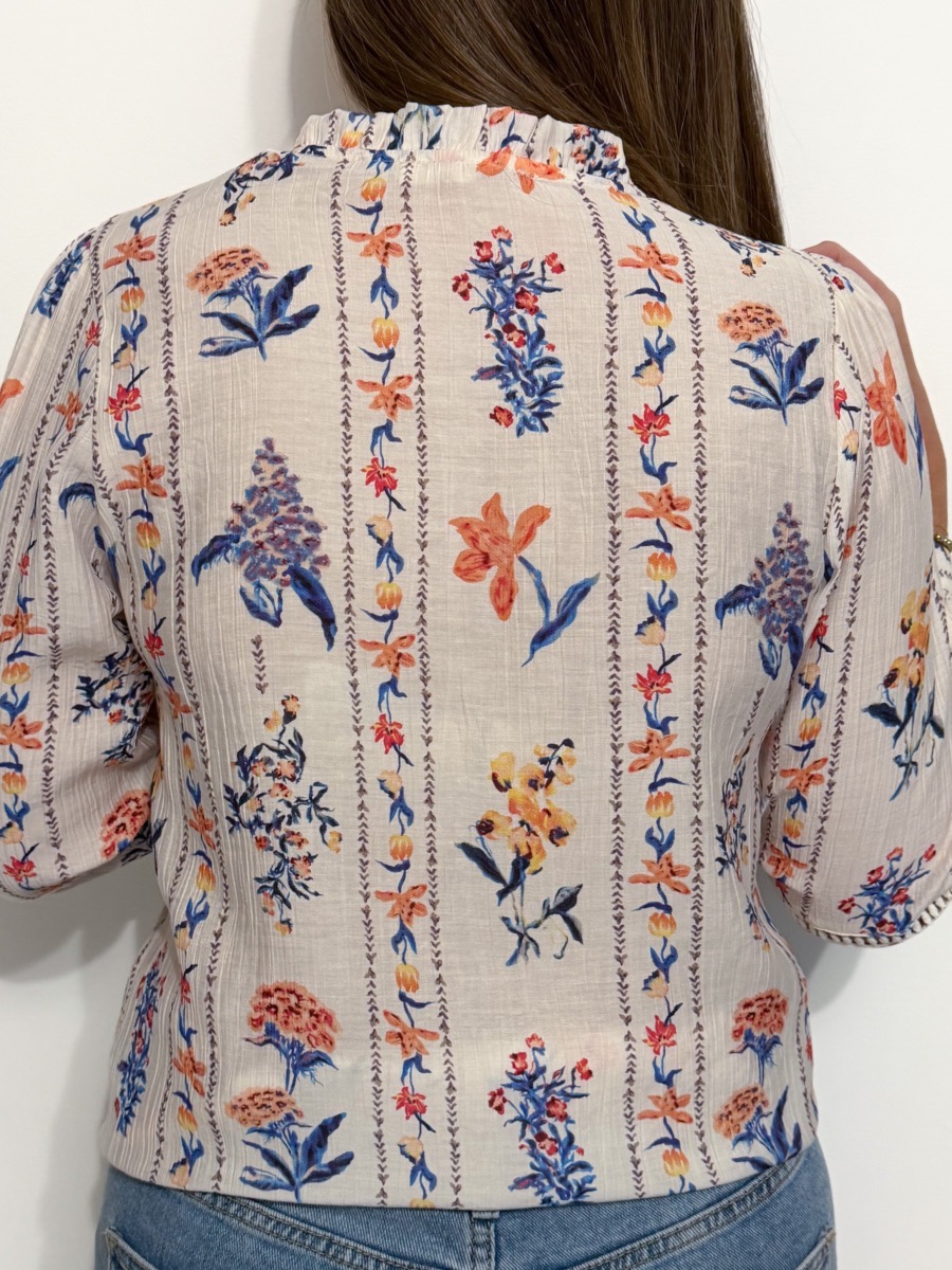 Blouse imprimée coloris bleu, orange, jaune sur fond écru.