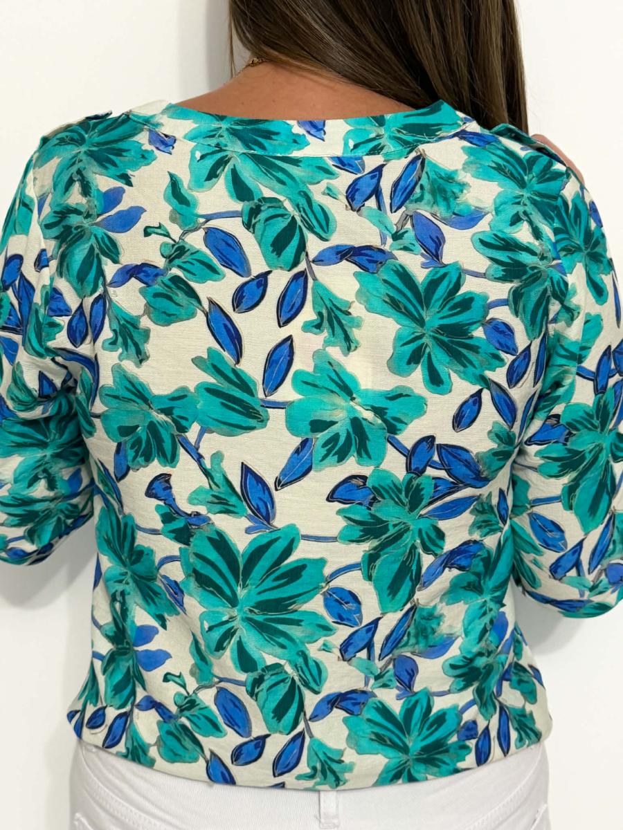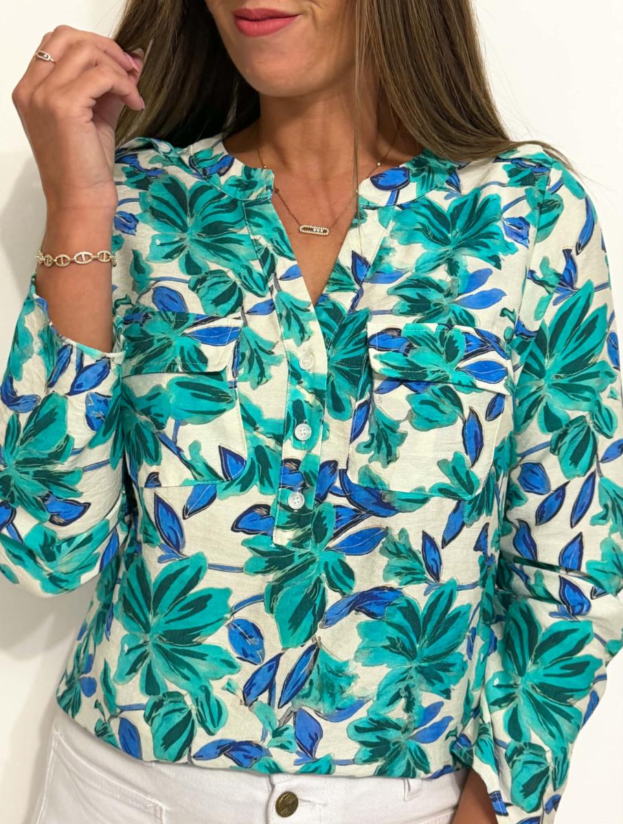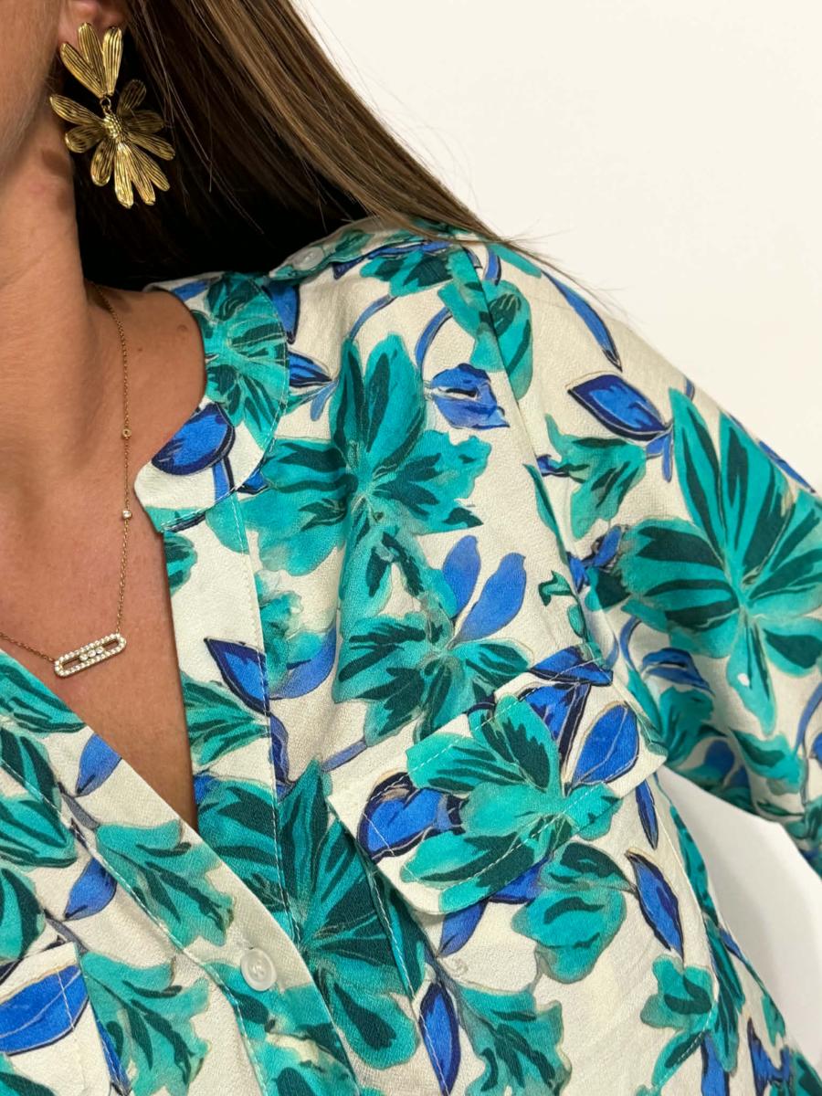 Blouse imprimée coloris vert et bleu dur fond écru.