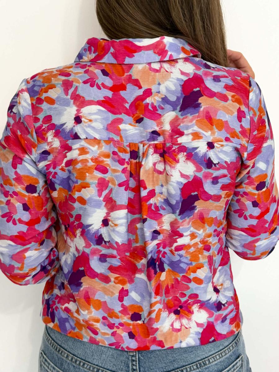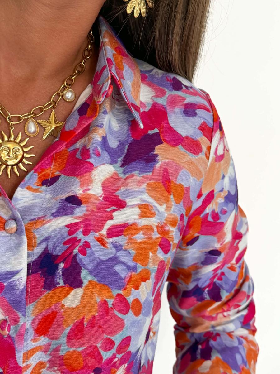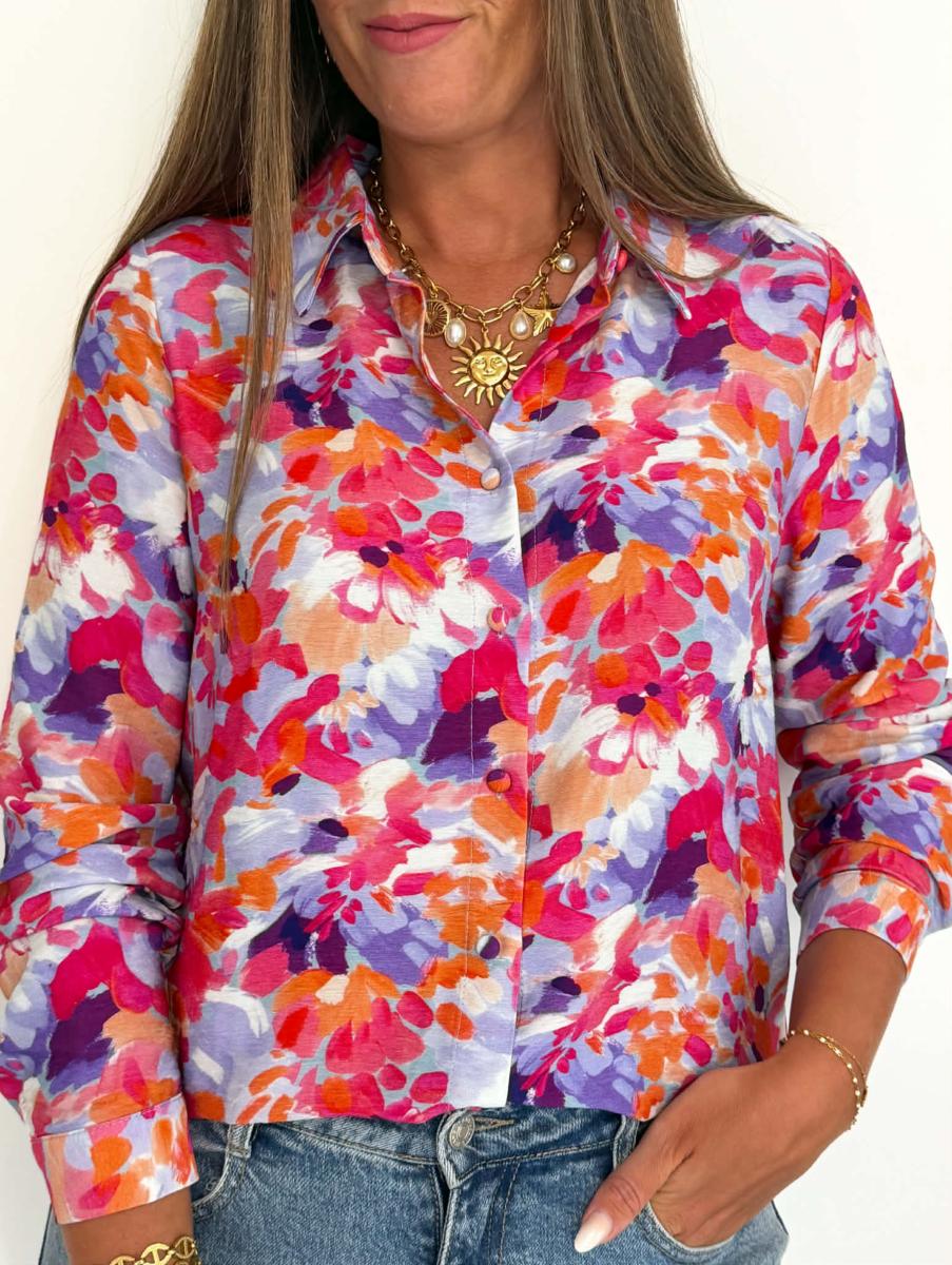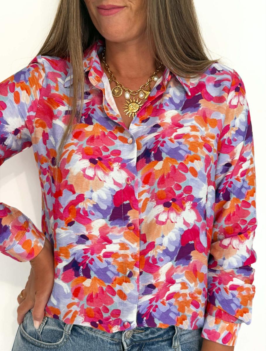 Blouse imprimée coloris saumon, fuchsia, violet, bleu, blanc.