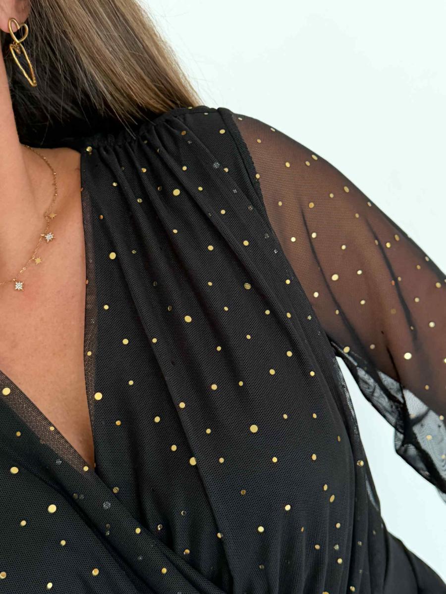 Partie haute ornée de sequins dorés.