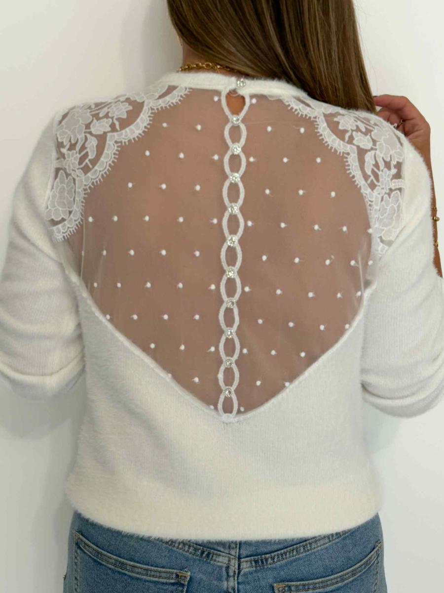 Joli dos orné de dentelle, plumetis et boutons en strass.