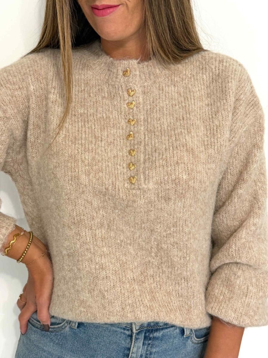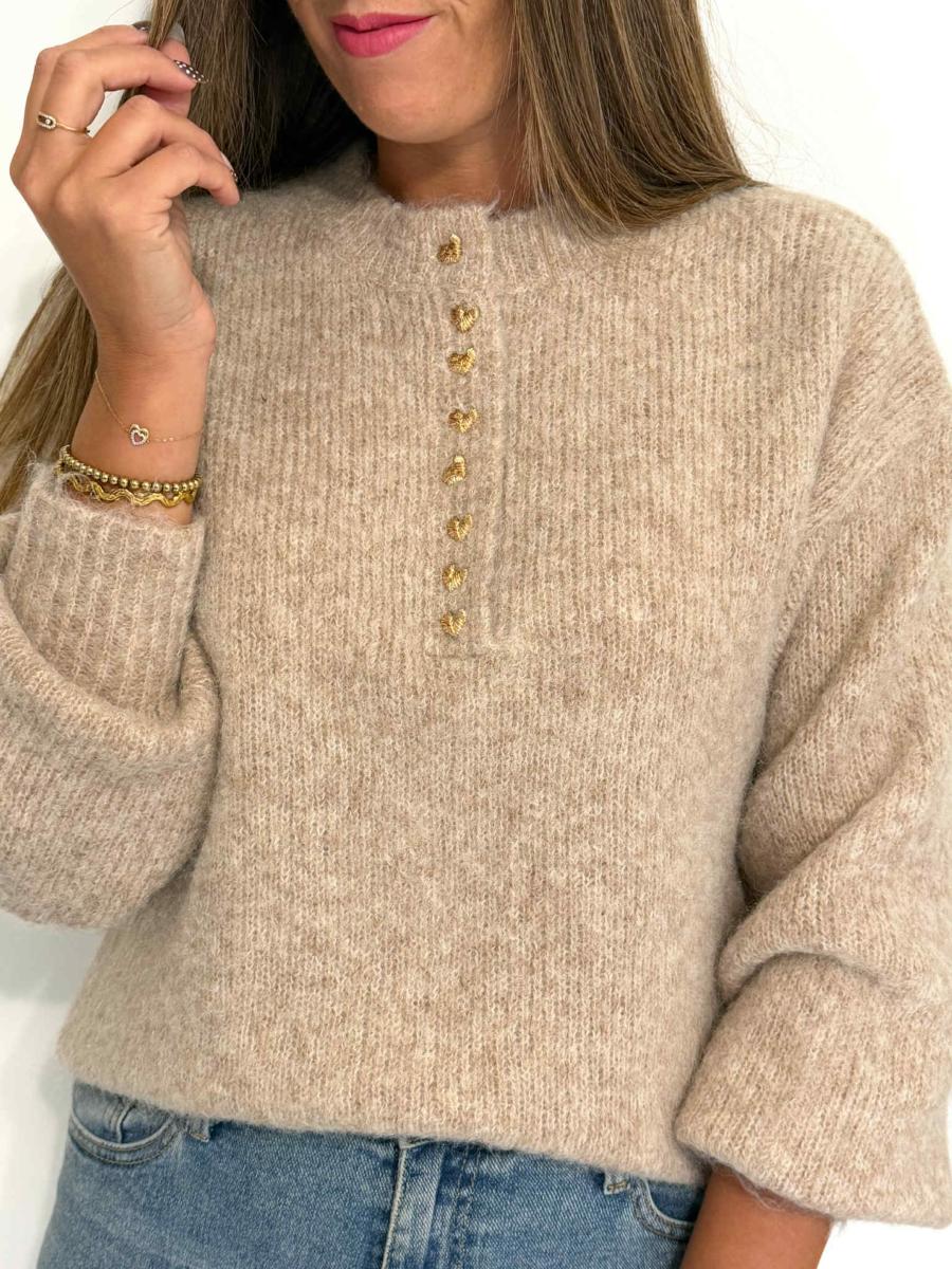 Boutonnière au col avec boutons dorés en formes de cœurs.