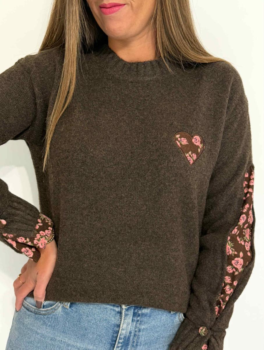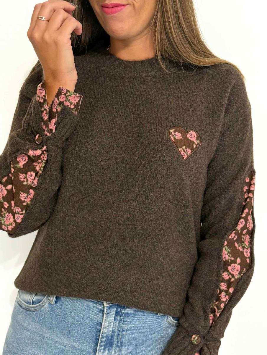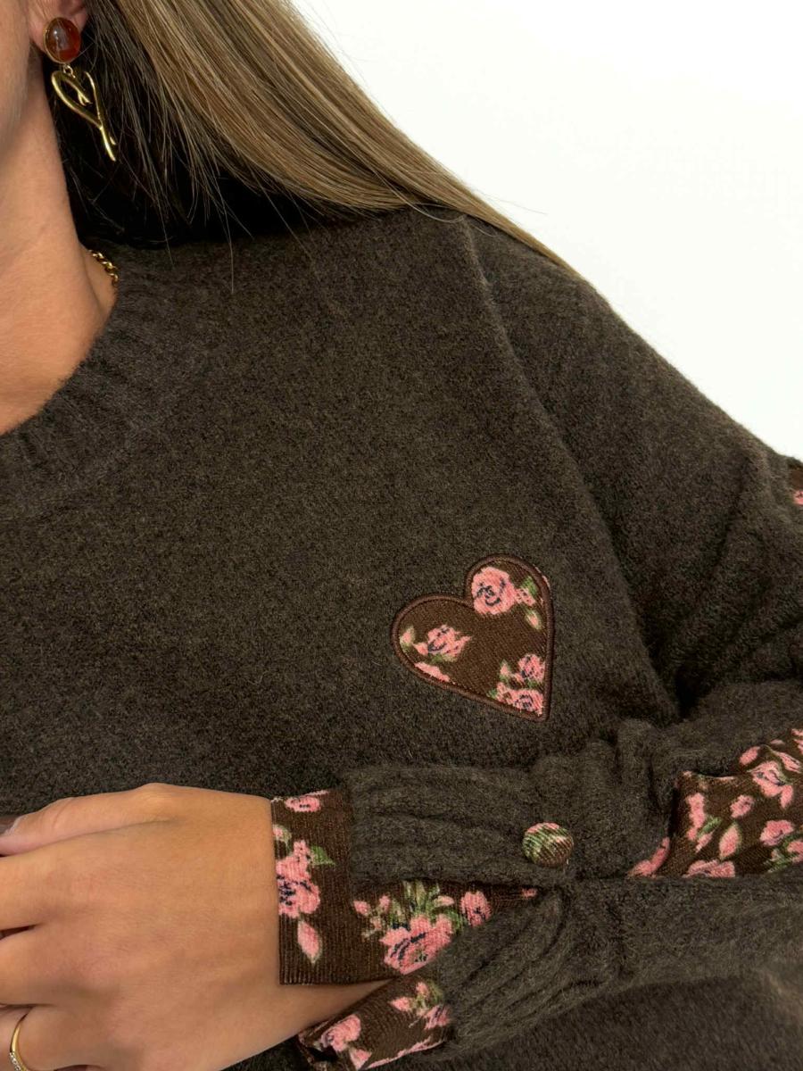 Cœur sur la poitrine, manches et boutons aux poignets en velours côtelé imprimé fleuri.