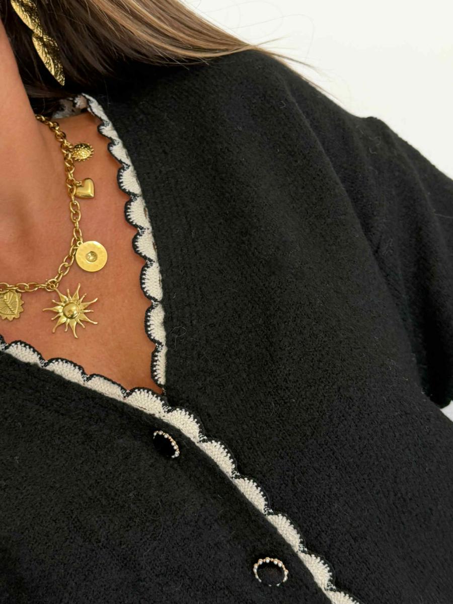 Ornés de festons coloris écru au col et le long de la boutonnière.