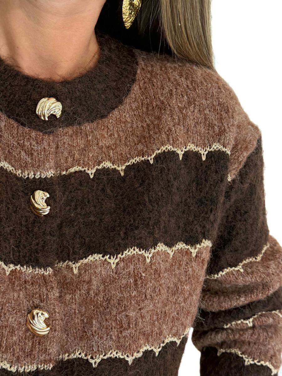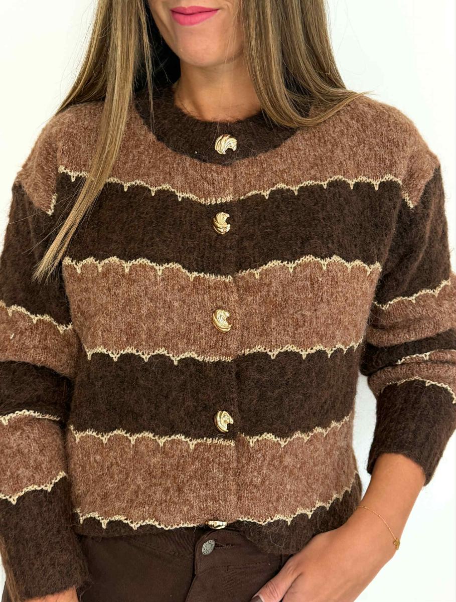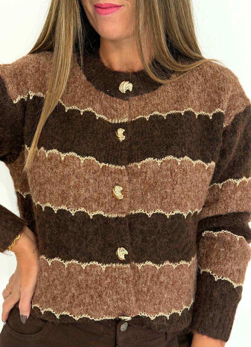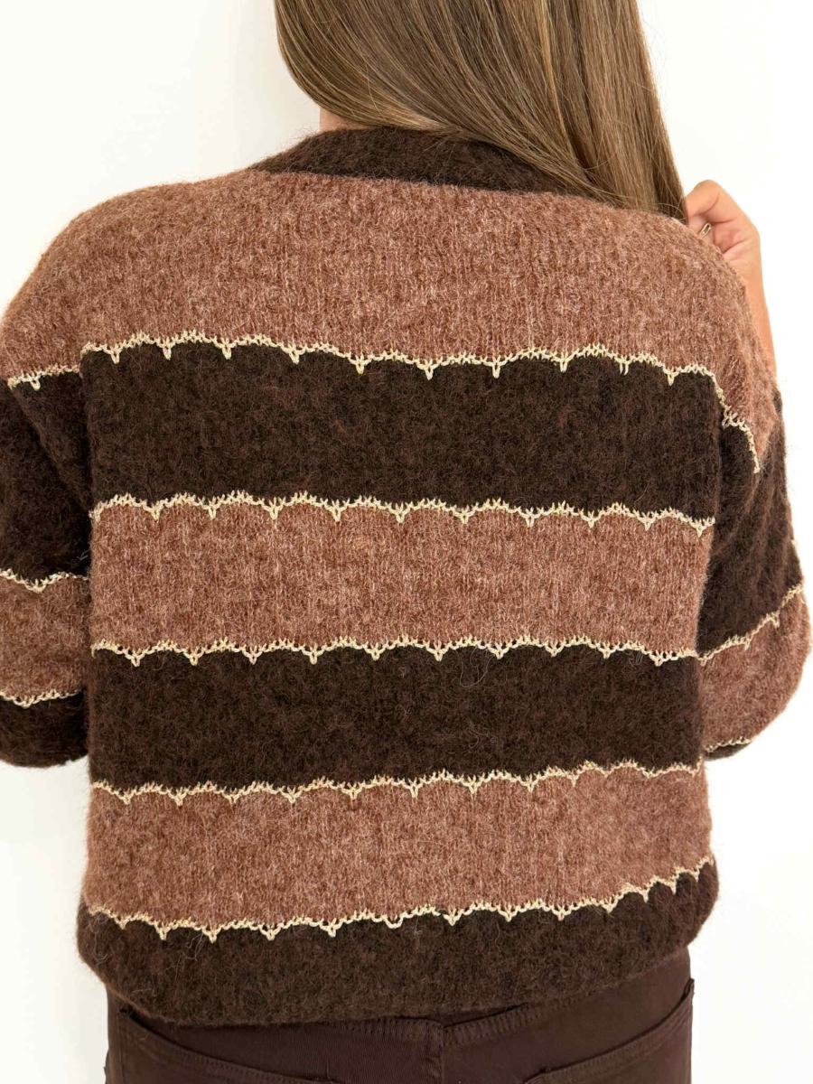 Gilet rayé tons marrons.