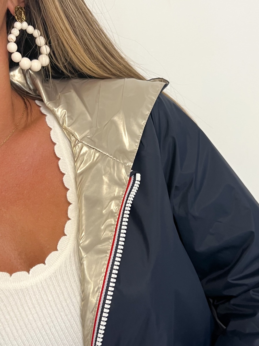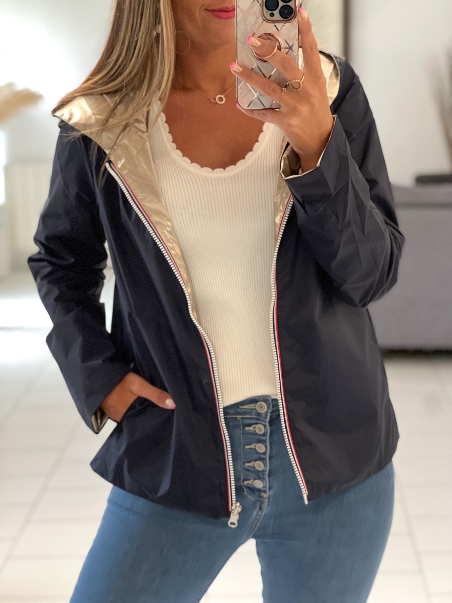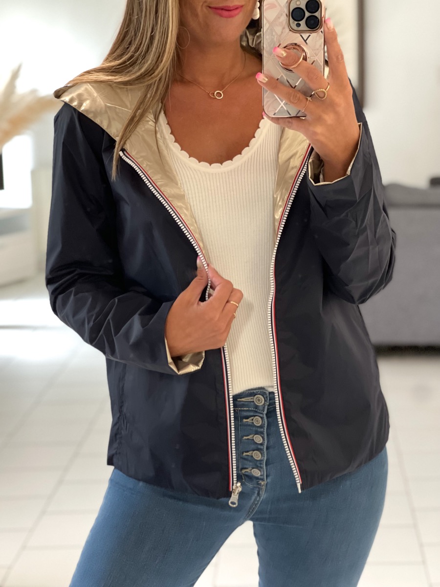 Superbe imperméable réversible coloris marine/or.