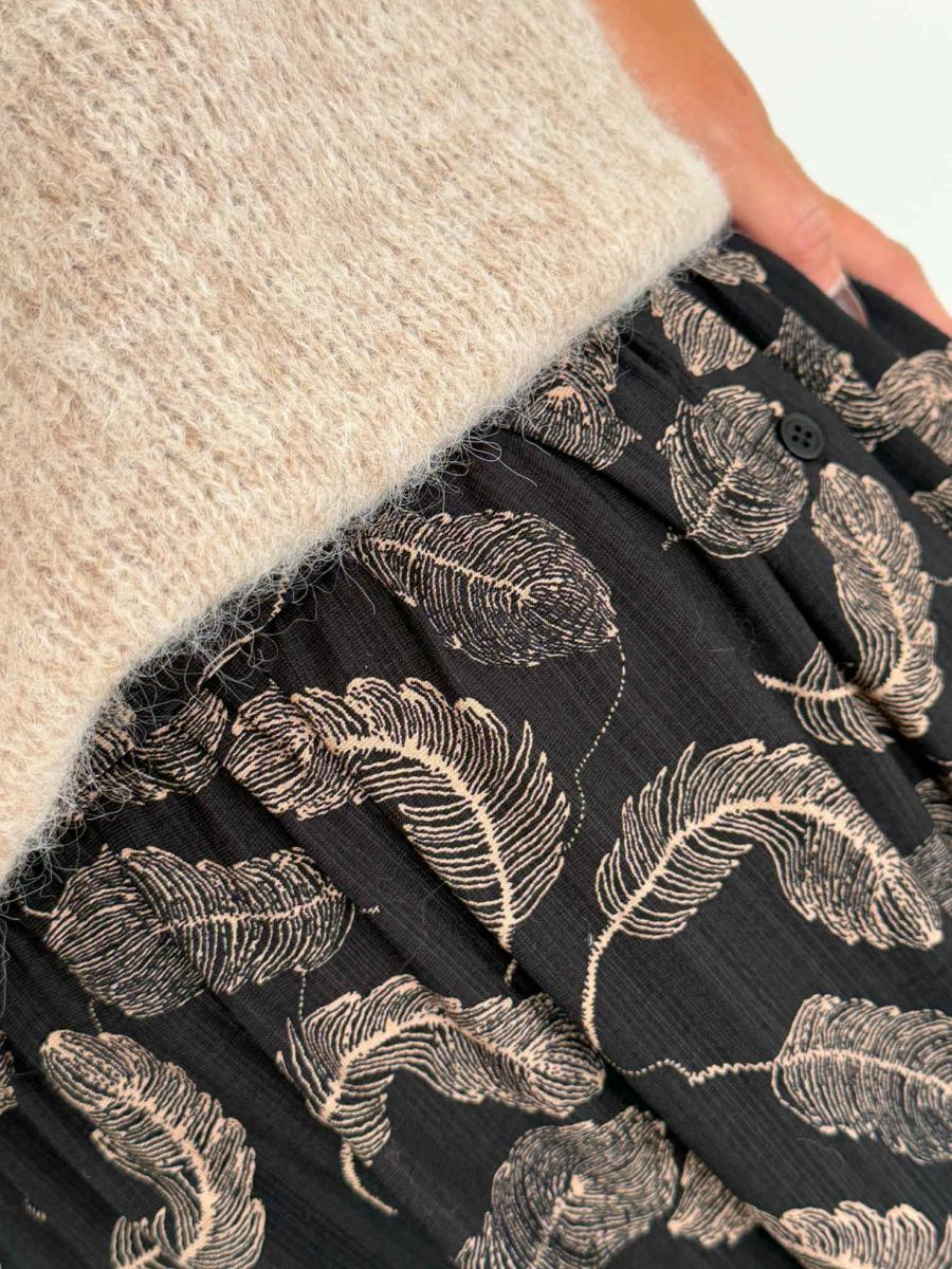 Jupe longue imprimée sur fond noir.