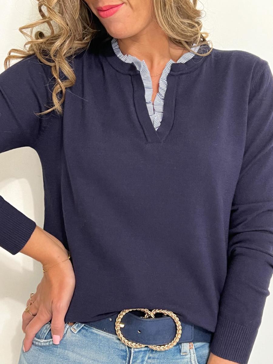 Col V orné de tissus froncé rayé bleu ciel et blanc.