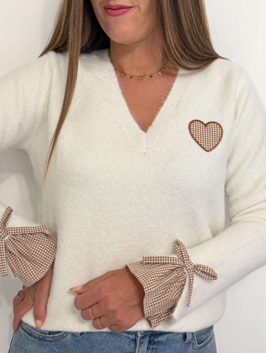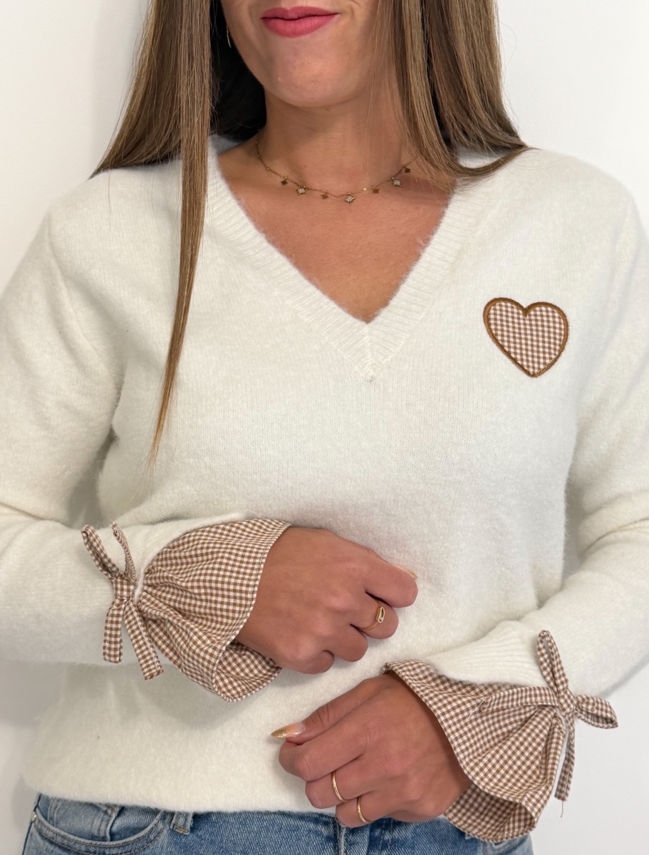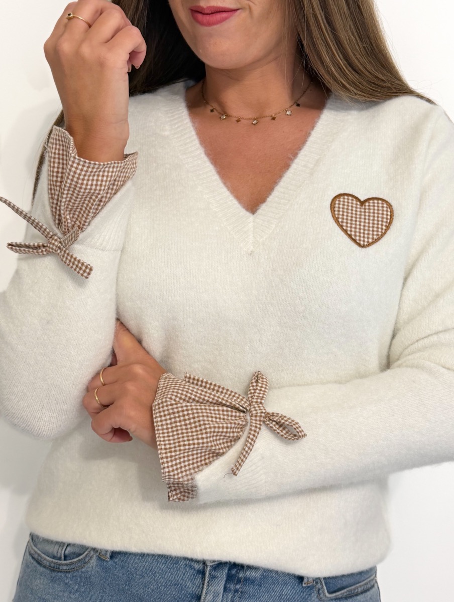 Cœur sur la poitrine vichy blanc et marron.