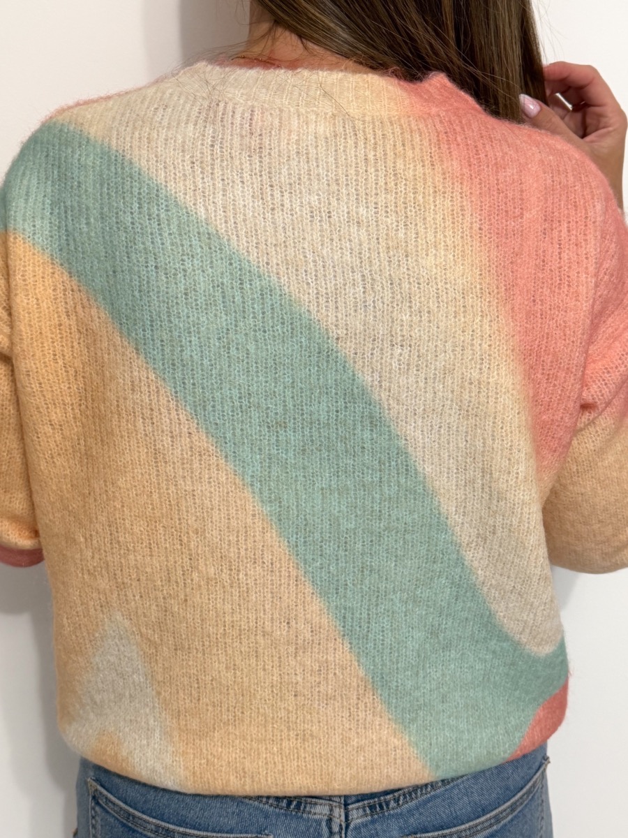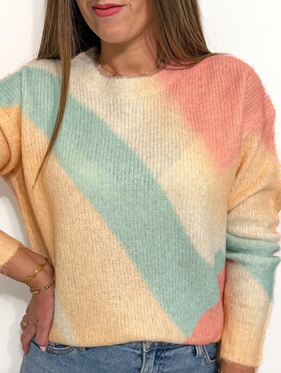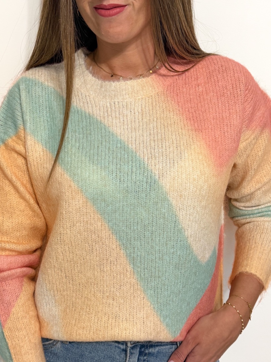 Pull coloris jaune, vert, beige et rose.