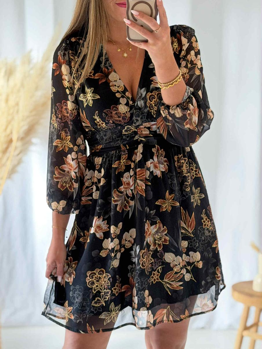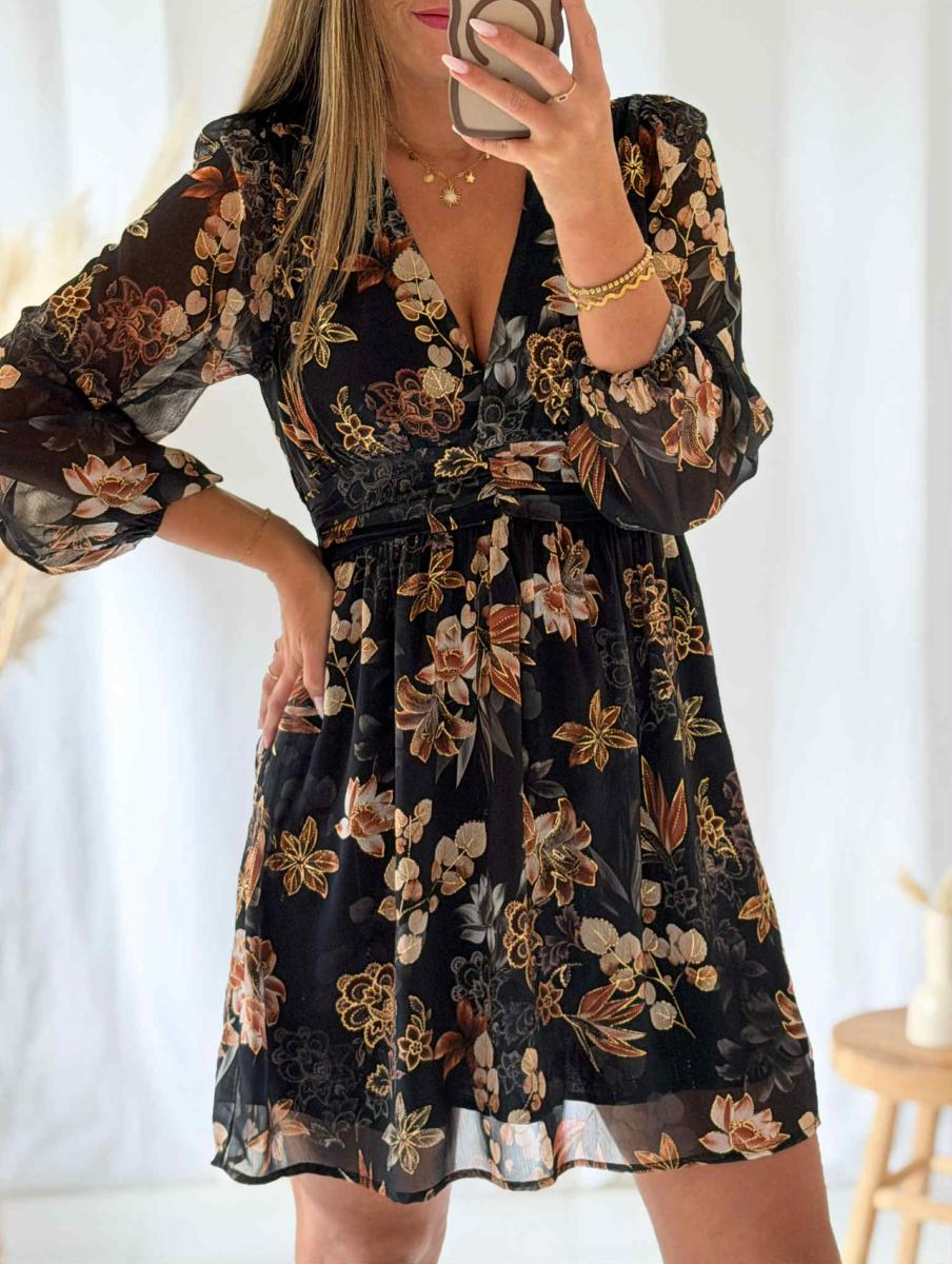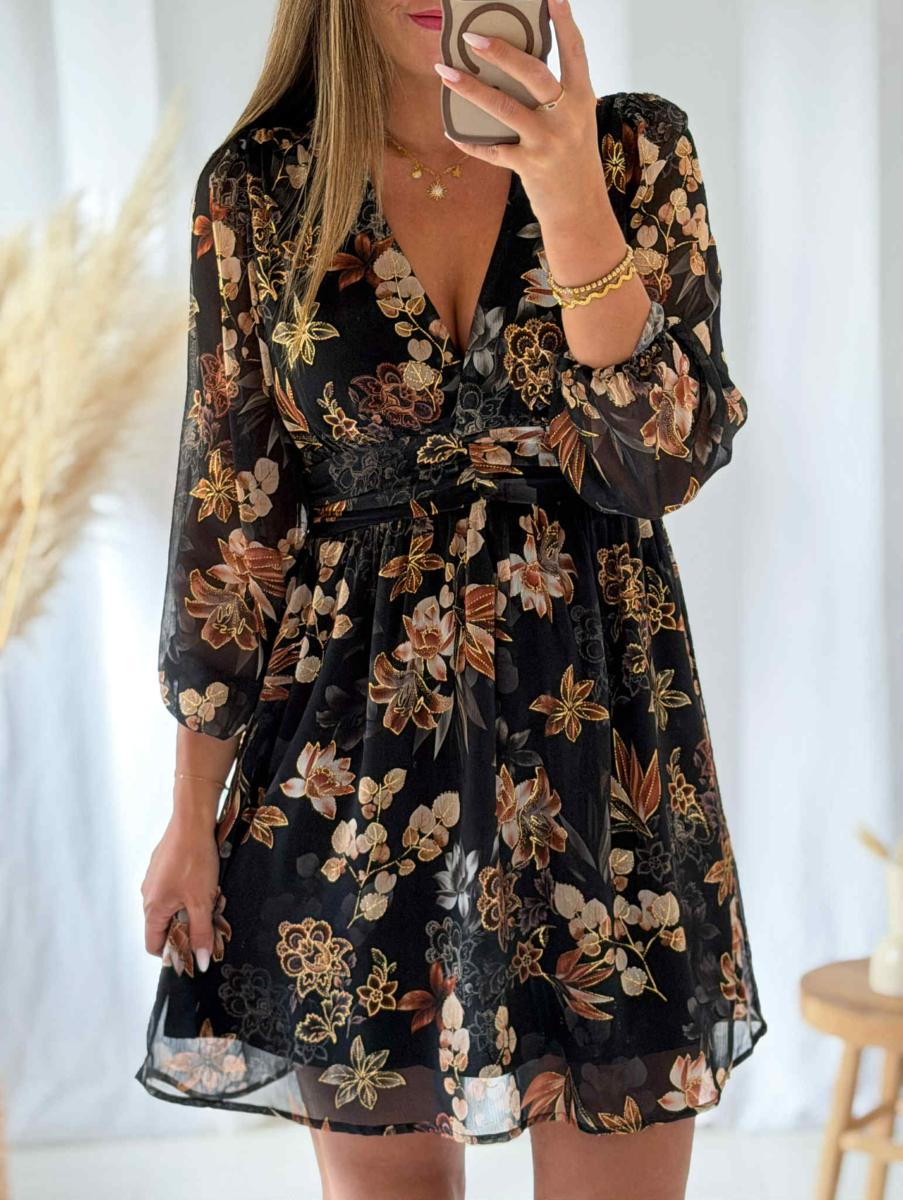 Robe imprimée tons marrons et beige sur fond noir.