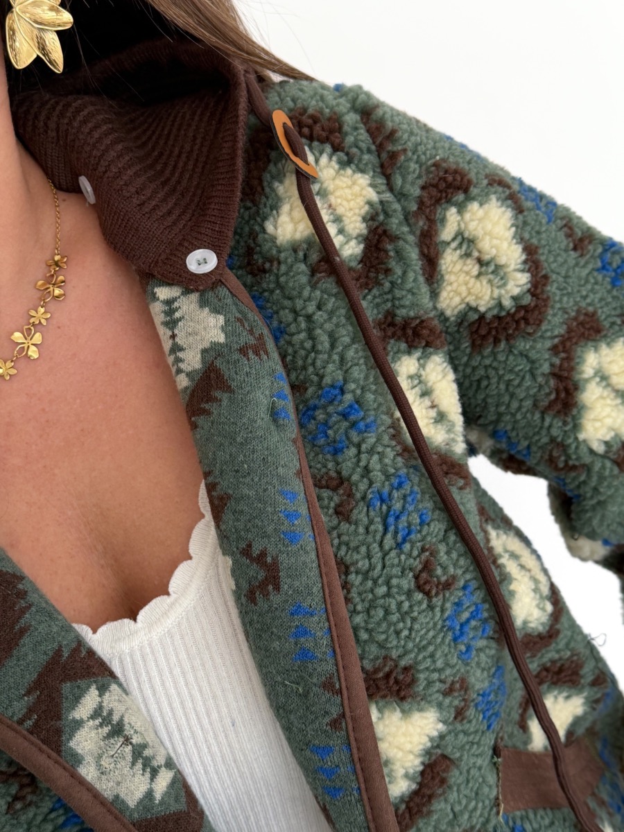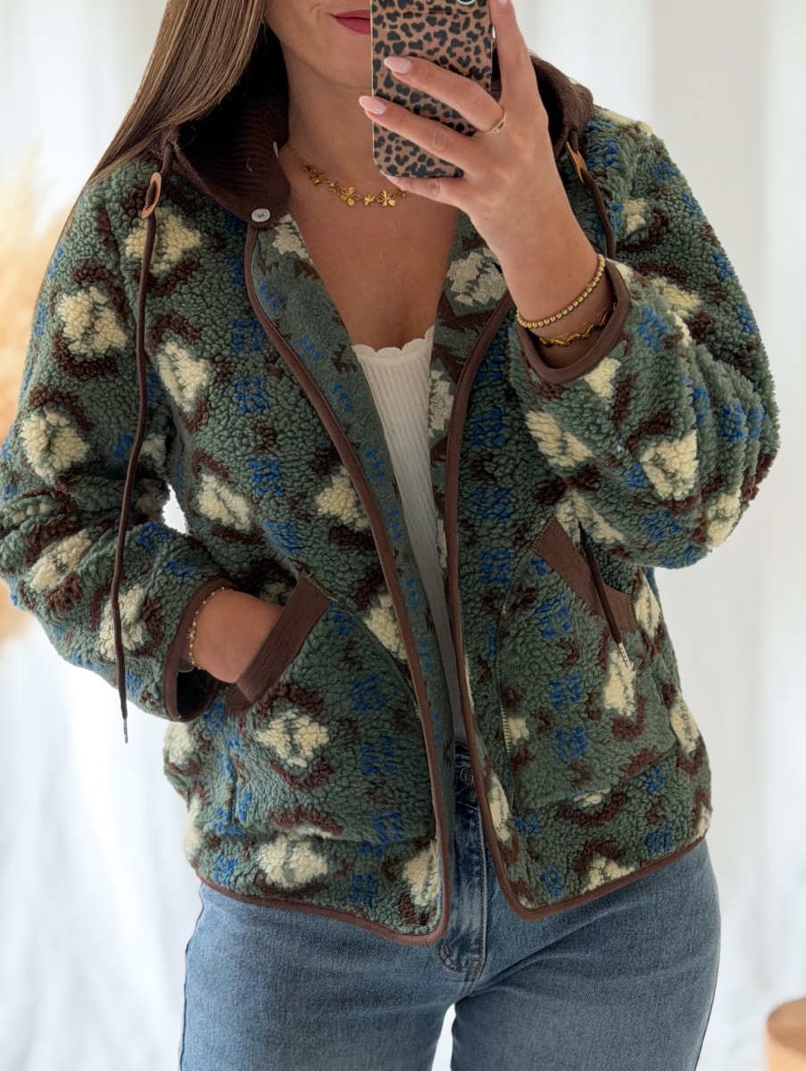 Veste en moumoute imprimée coloris vert, écru, bleu et chocolat.