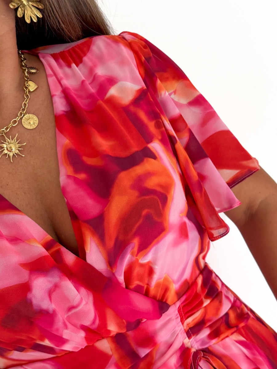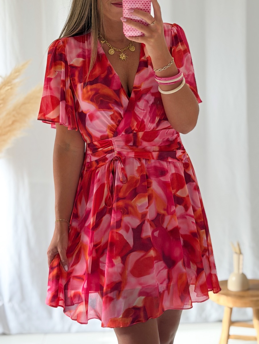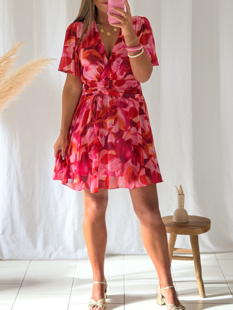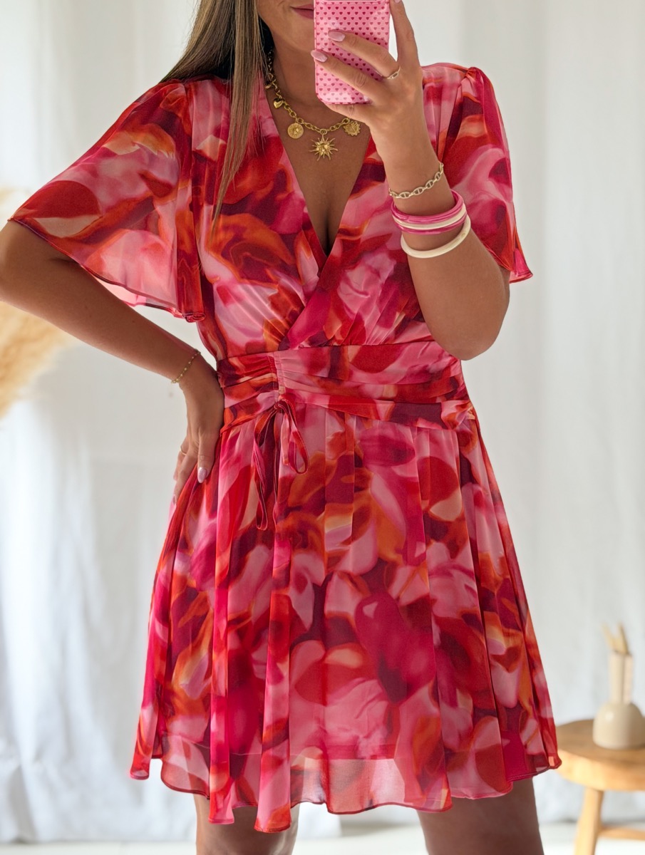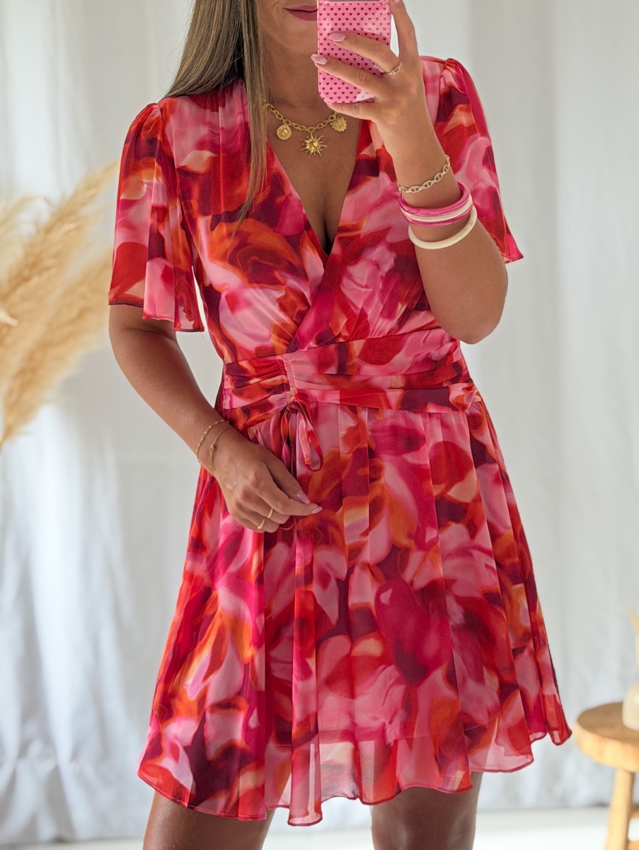 Robe imprimée tons roses et orange.