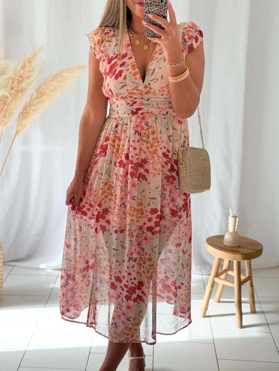 Robe imprimée coloris fuchsia, vert d'eau, orange, vert, sur fond rose.