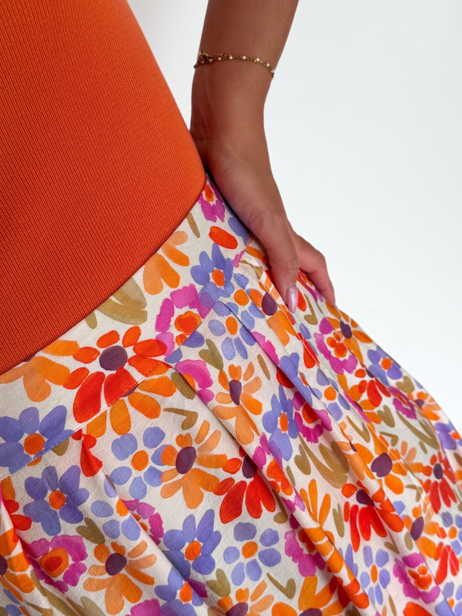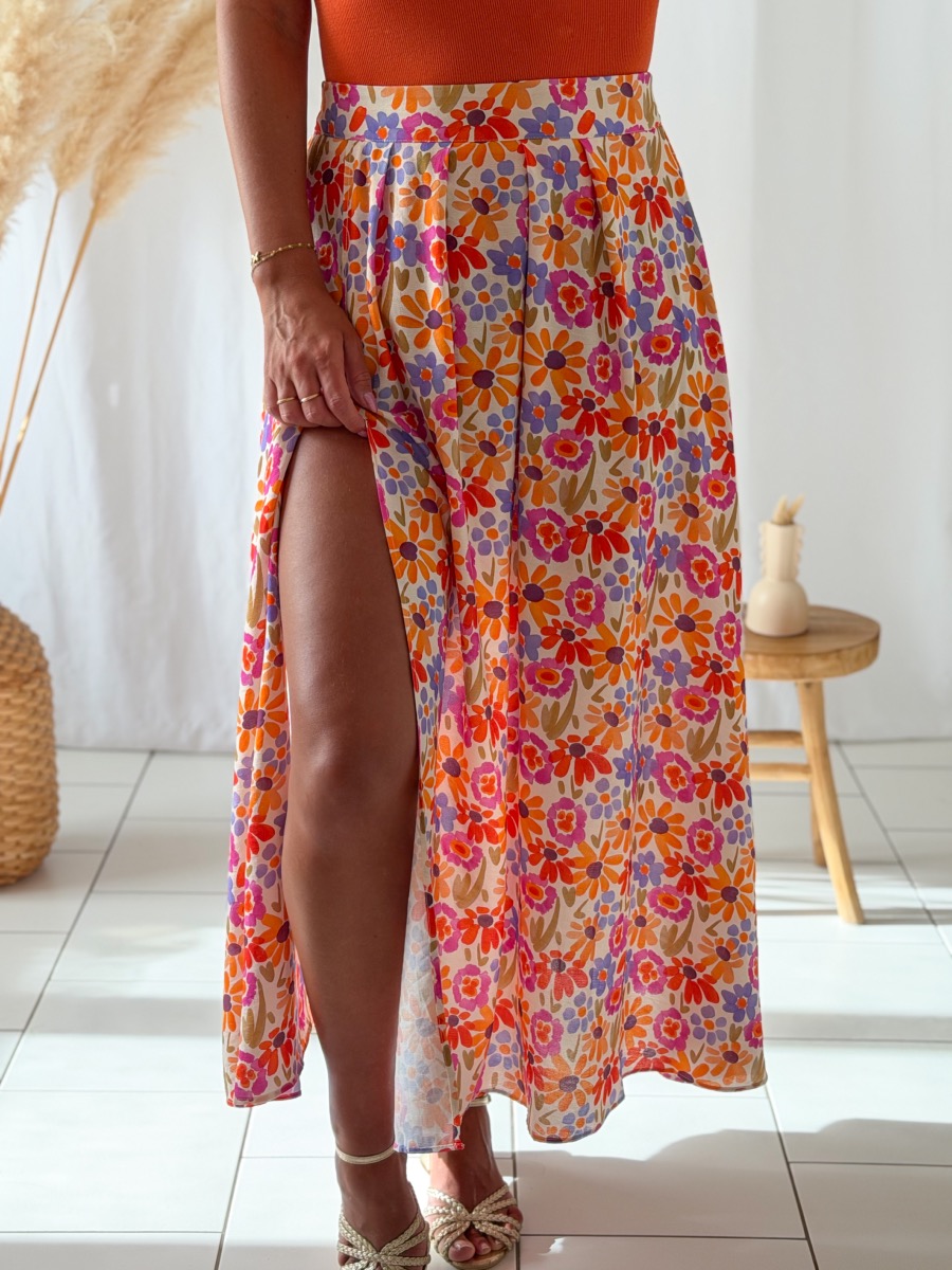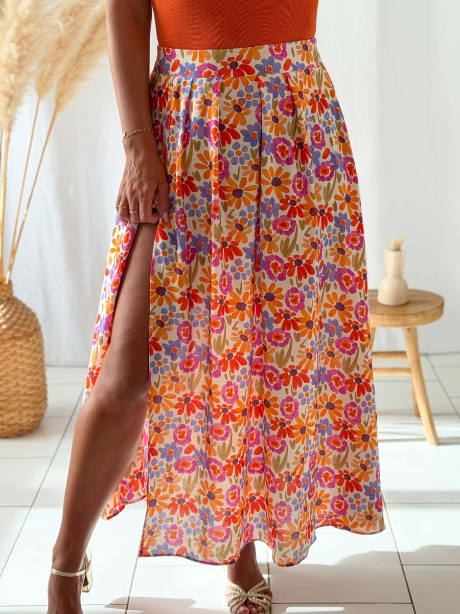 Jupe longue imprimée coloris bleu, orange, violet, vert sur fond écru.