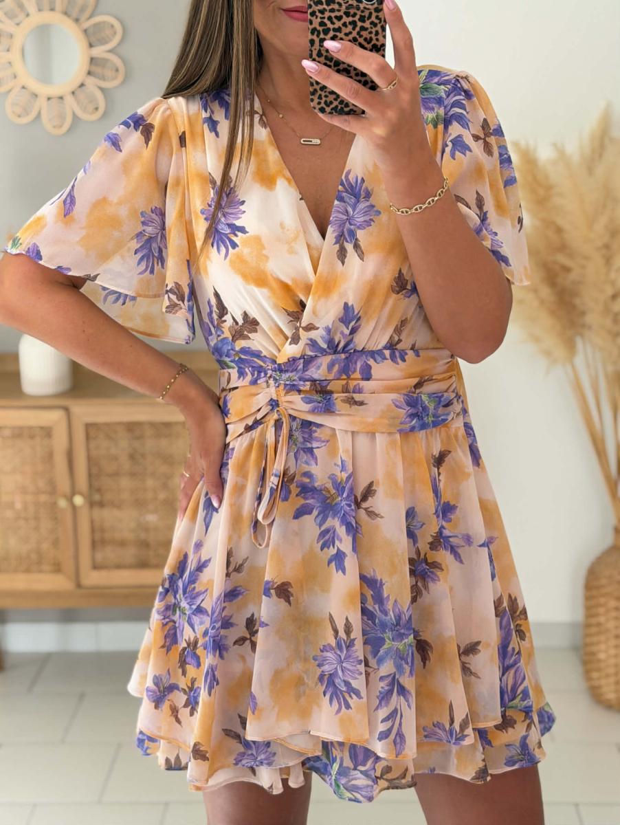 Robe coloris violet, ocre, écru.