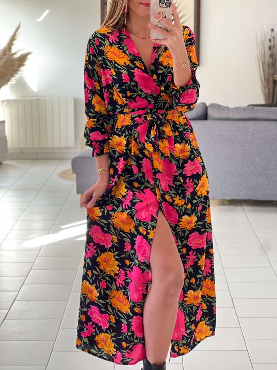 Robe longue coloris fuchsia, orange et vert sur fond noir.