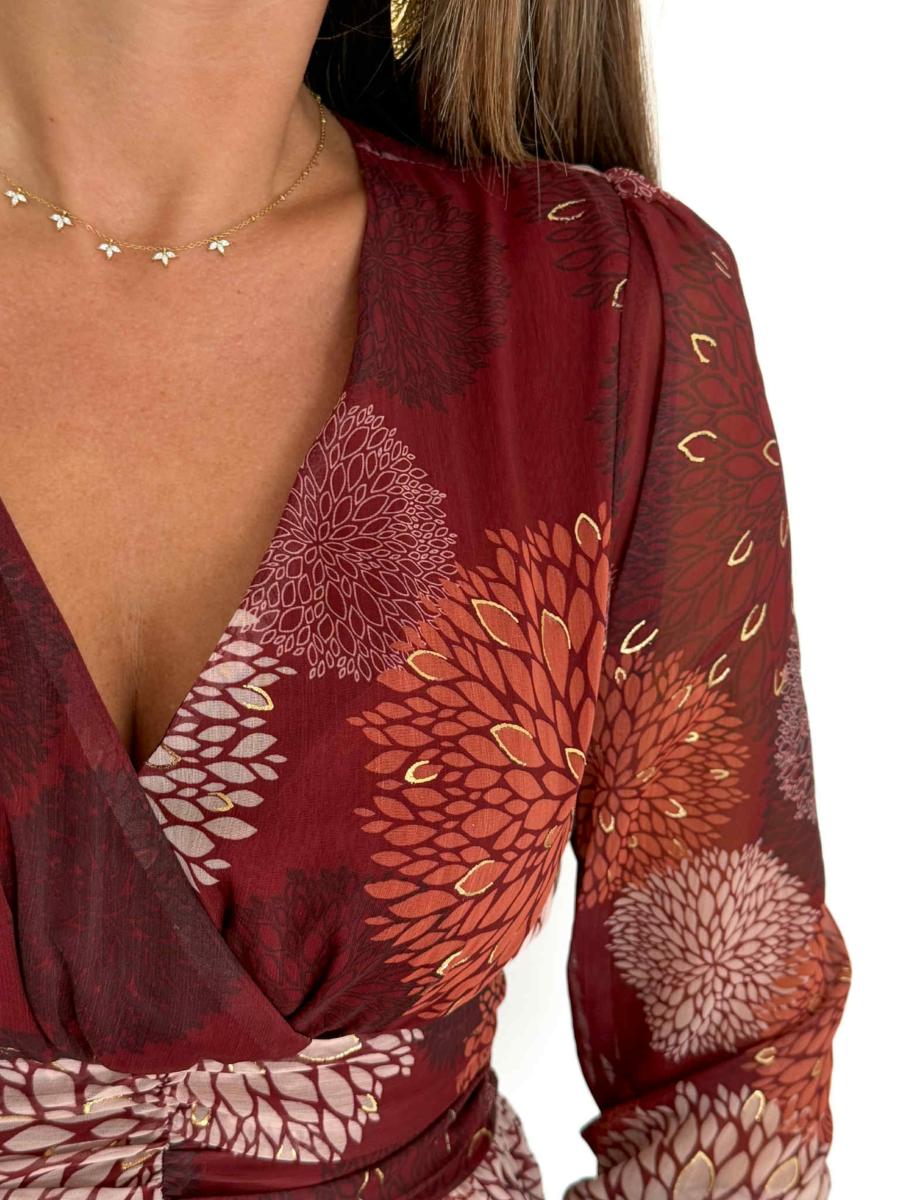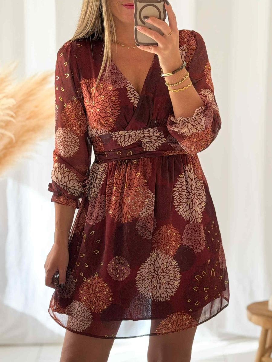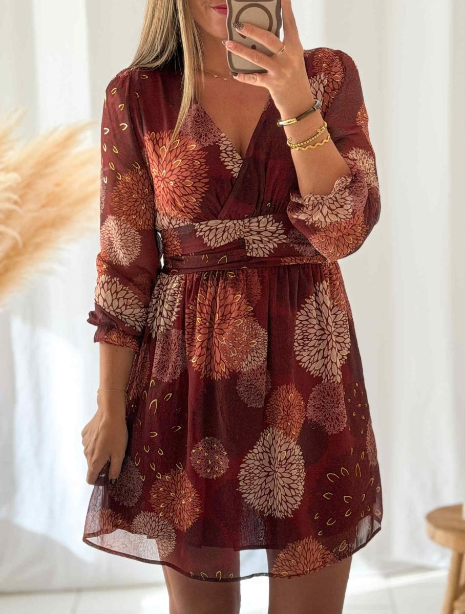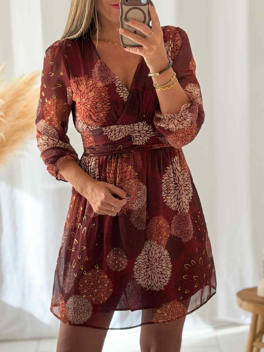 Robe Imprimée tons bordeaux et beige.
