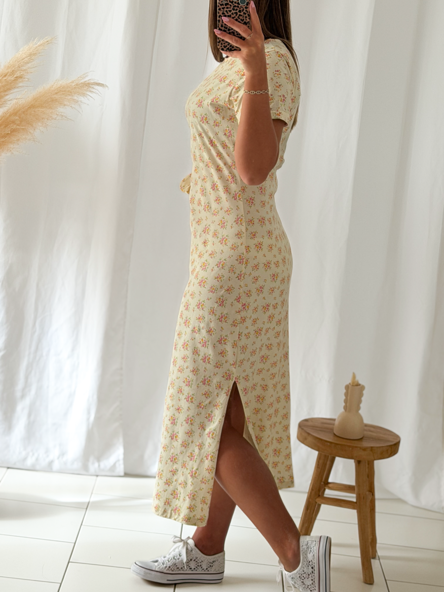 Robe longue fleurie sur fond beige.