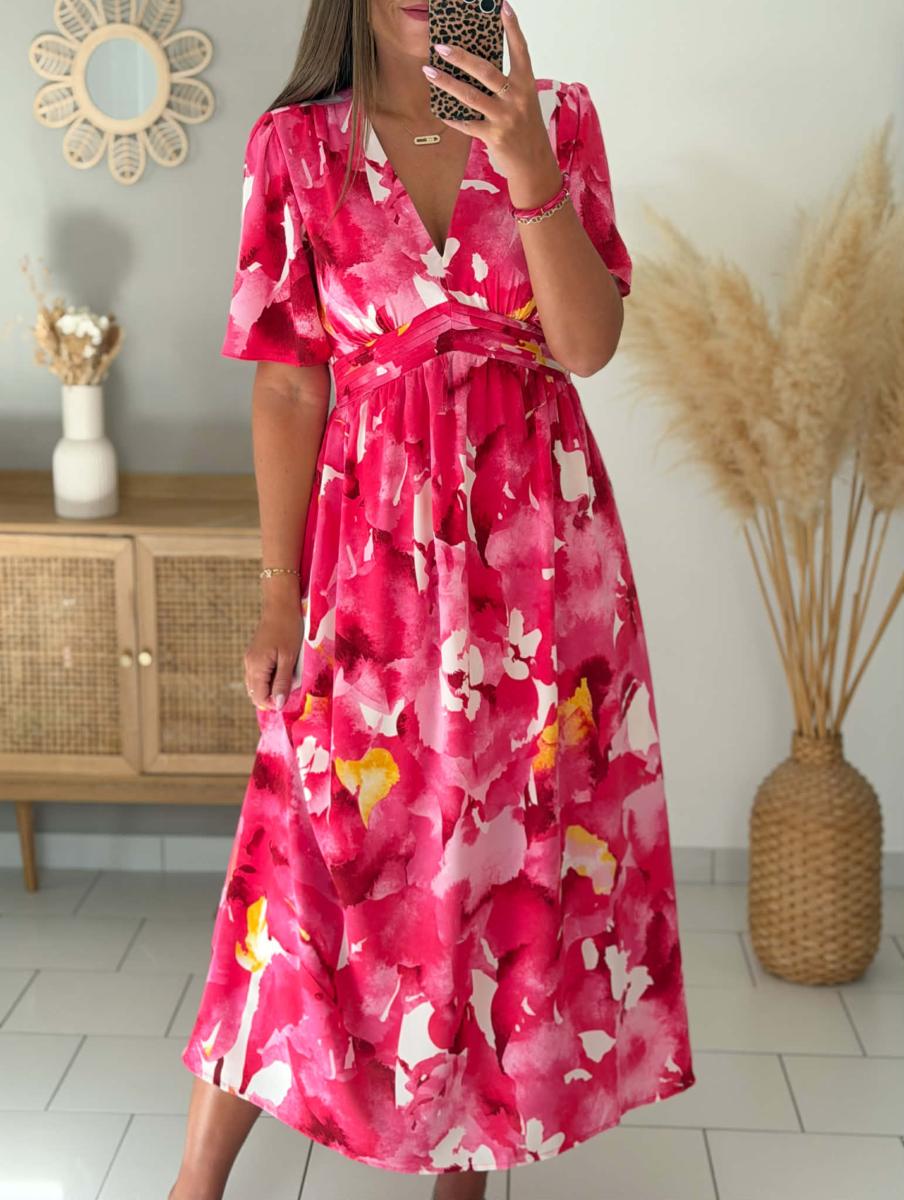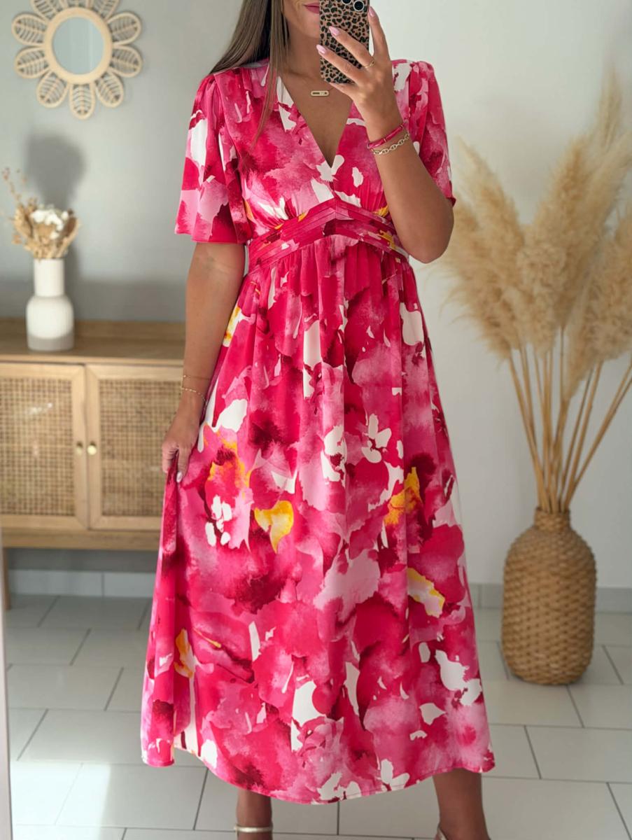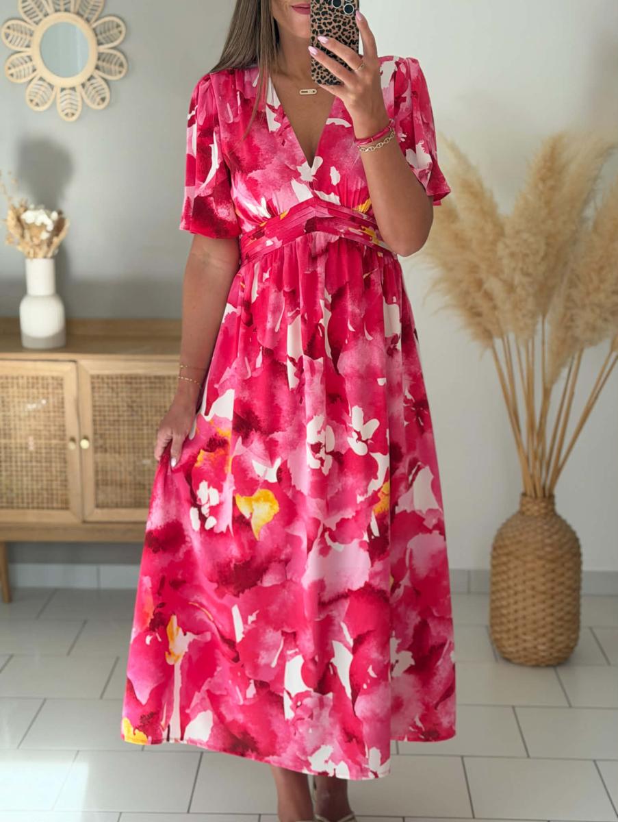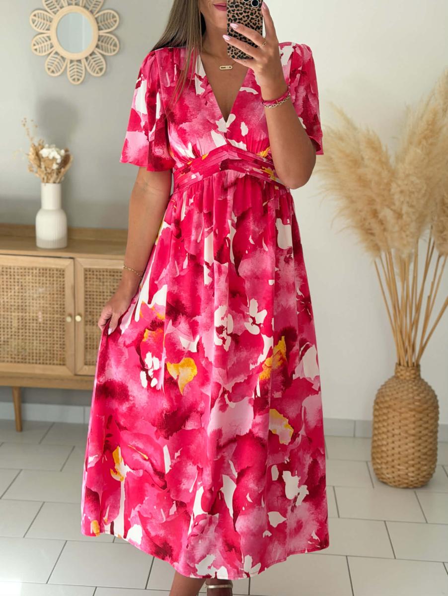 Robe longue imprimée coloris roses.