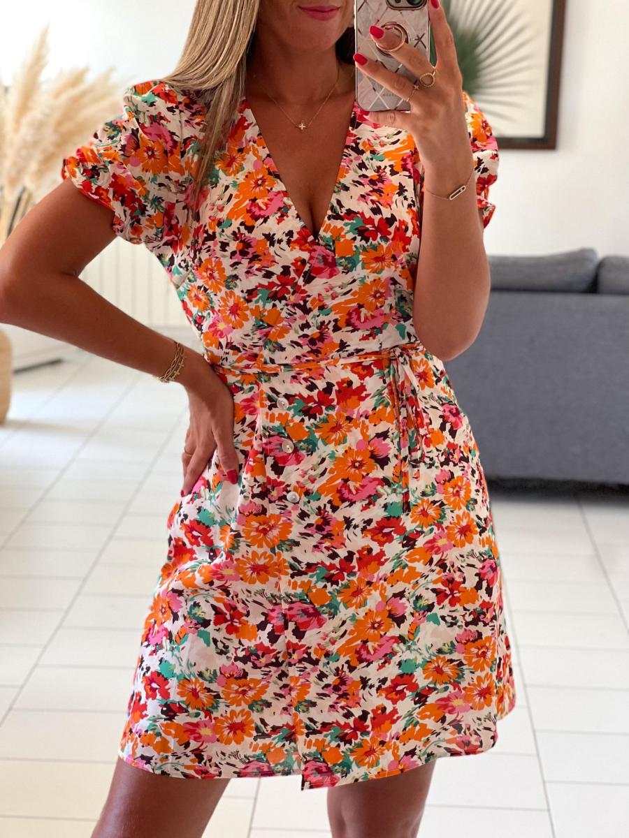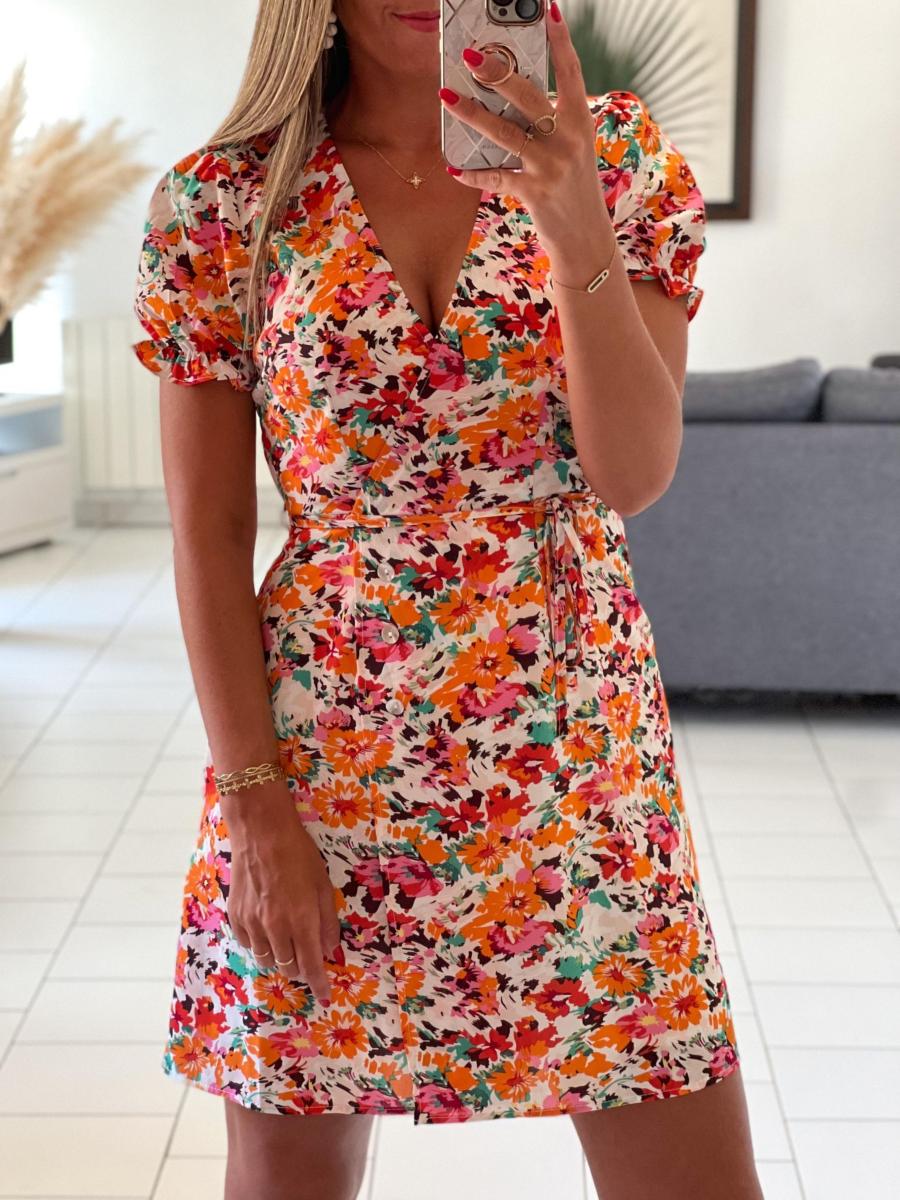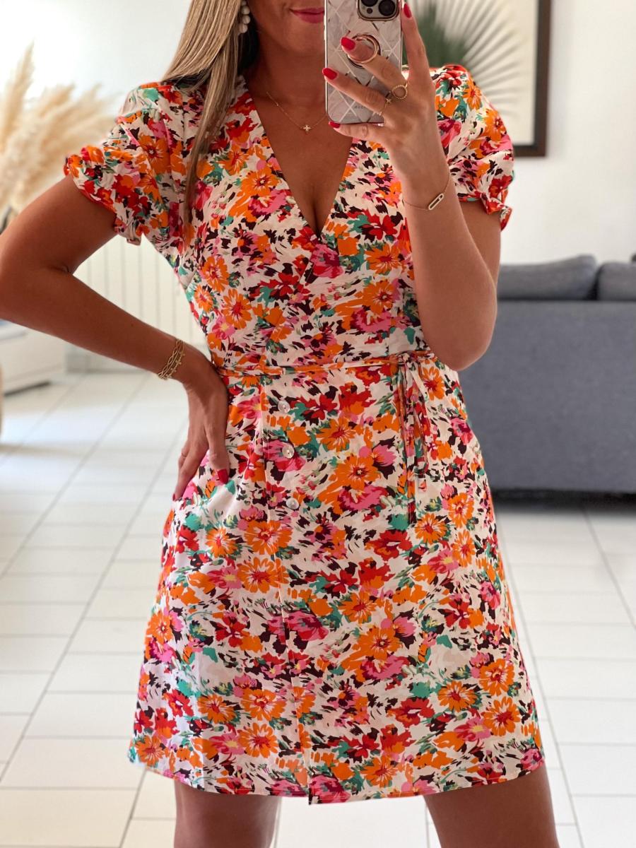 Robe fleurie coloris rose, vert, orange, rouge sur fond blanc.