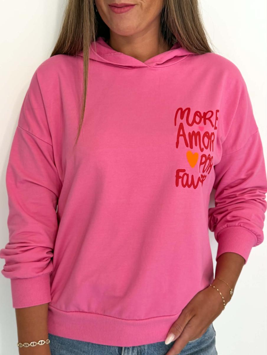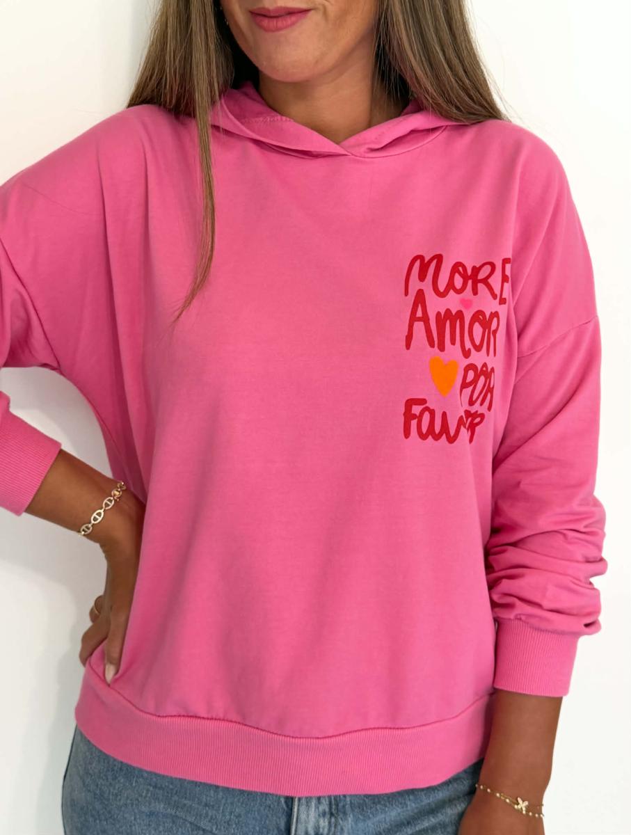 Sweat coloris fuchsia. Manches longues. Capuche. Inscription "More amor por favor"" sur la poitrine et le dos. Taille unique qui convient du 34 au 42.