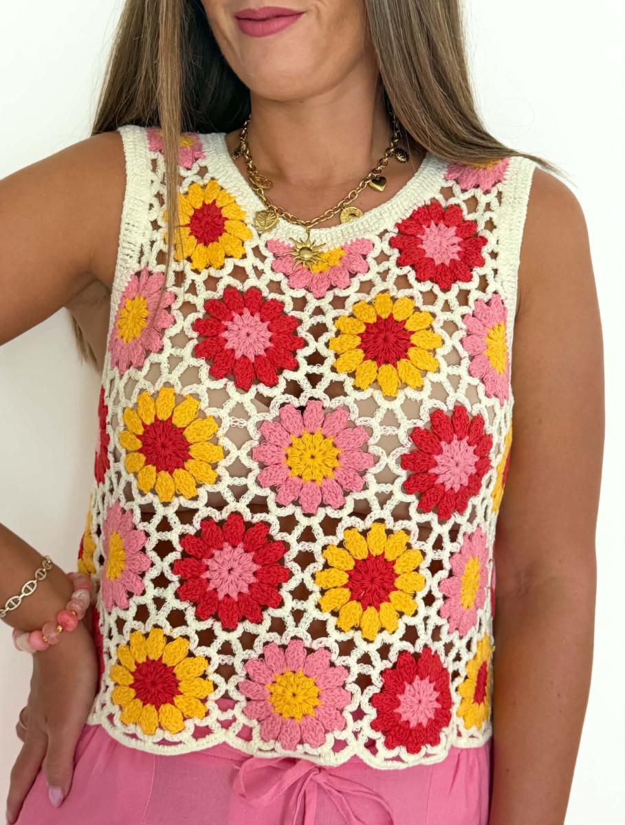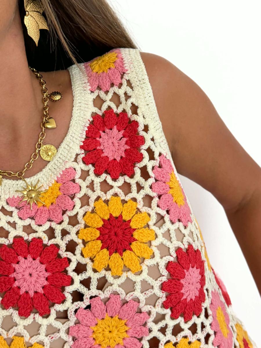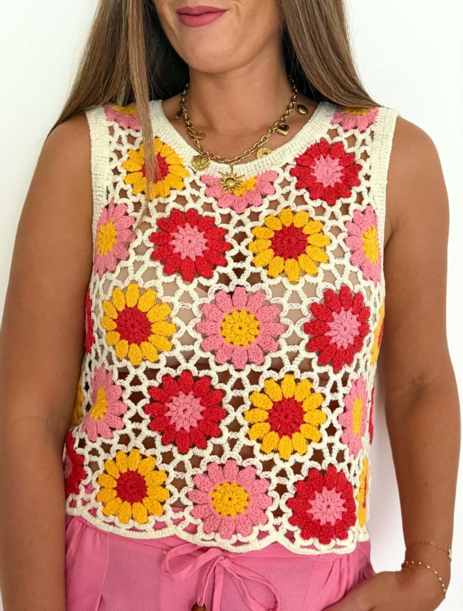 Top en crochet coloris beige, rouge, jaune et rose.