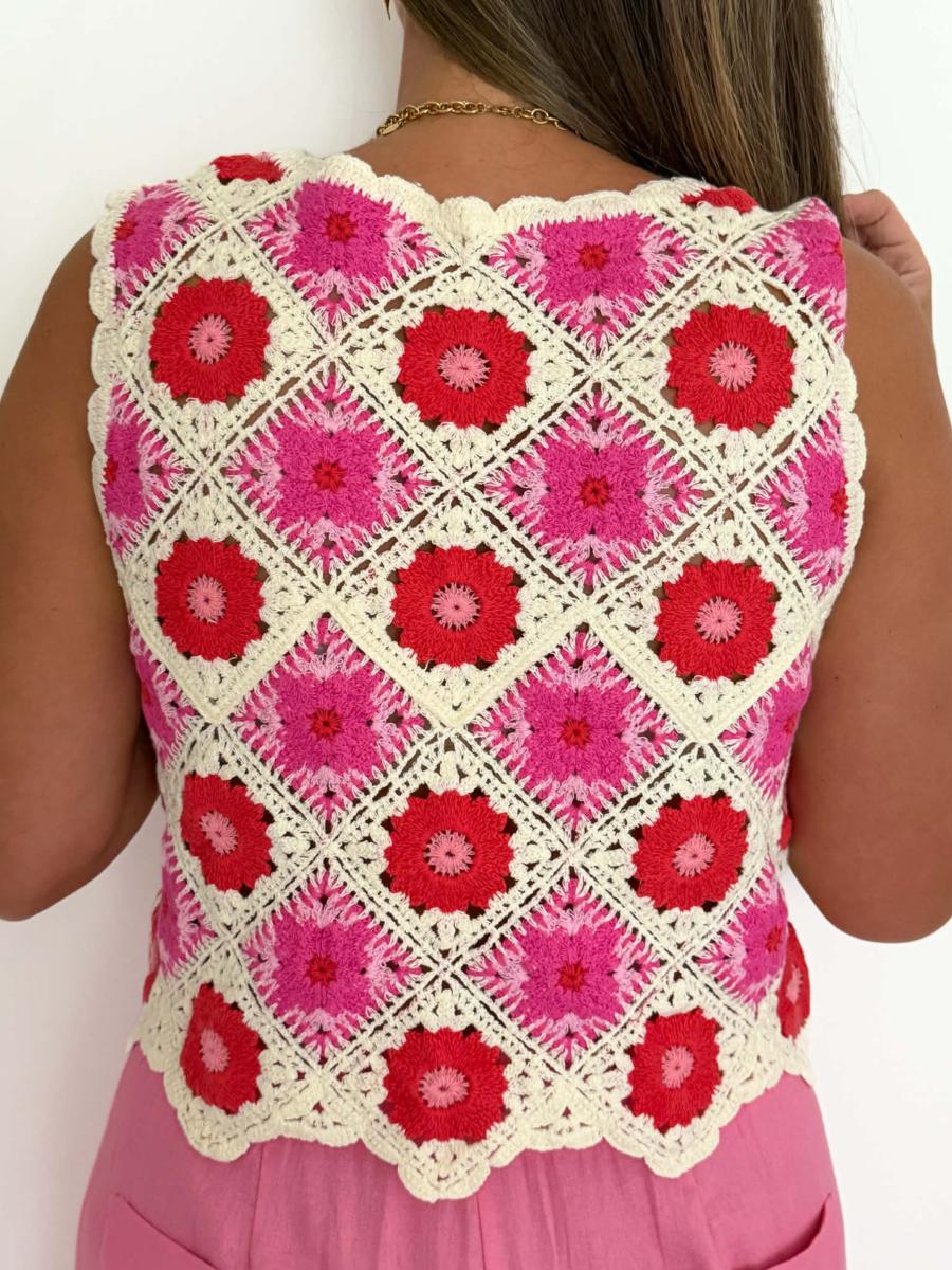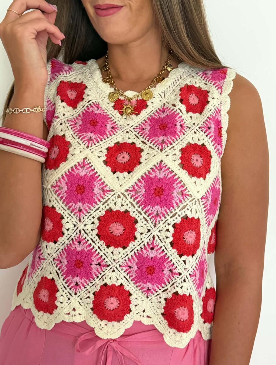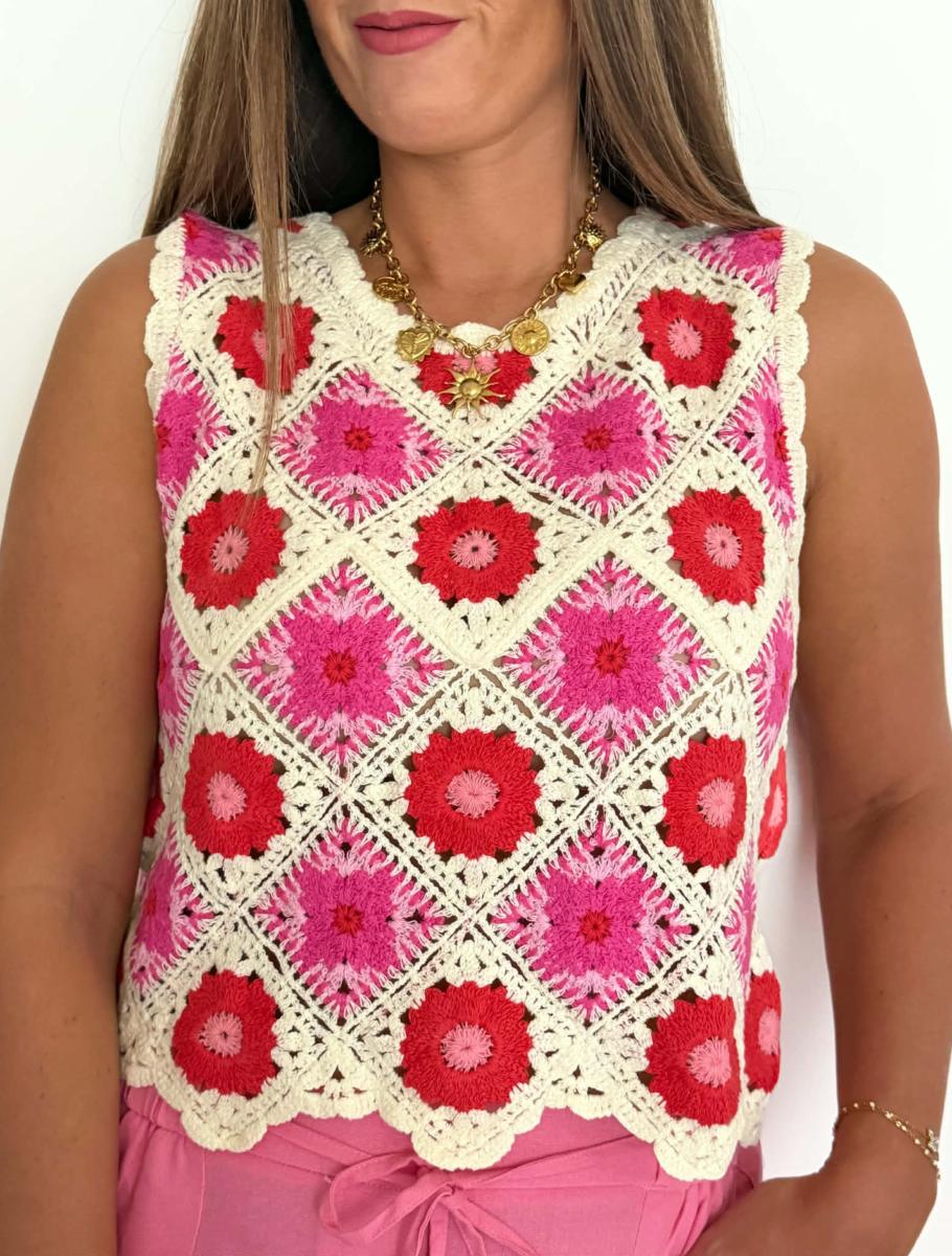 Top en crochet coloris beige, rose et rouge.