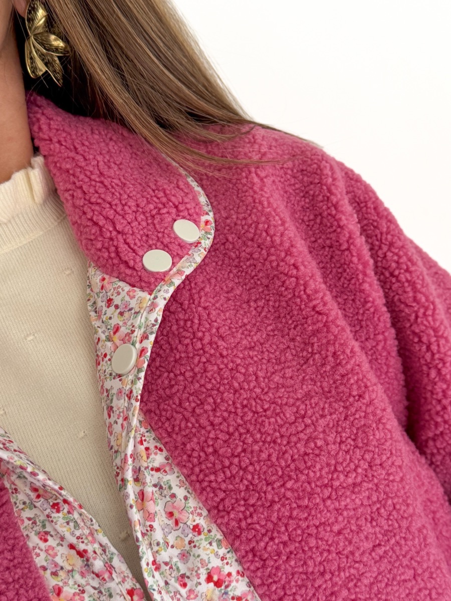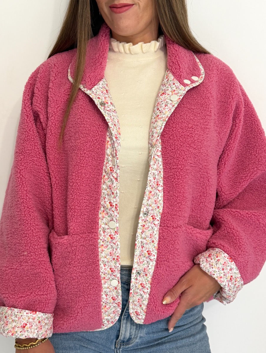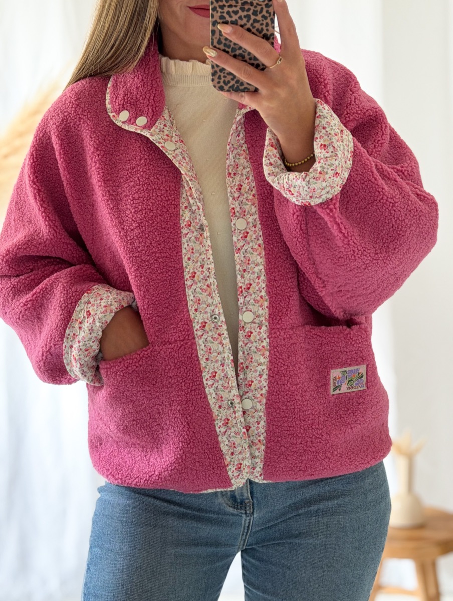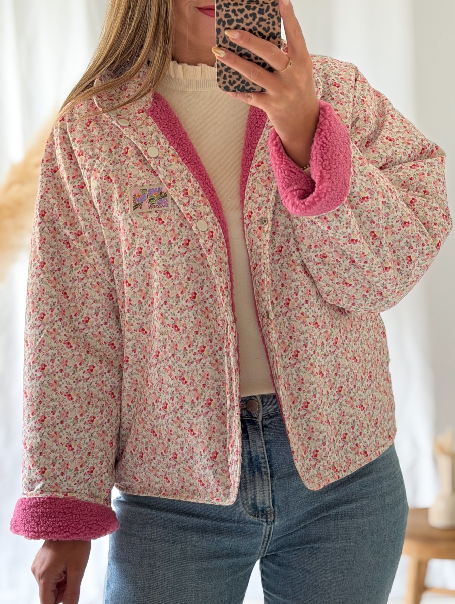 Veste réversible un côté en bouclette rose et un côté imprimé Liberty.