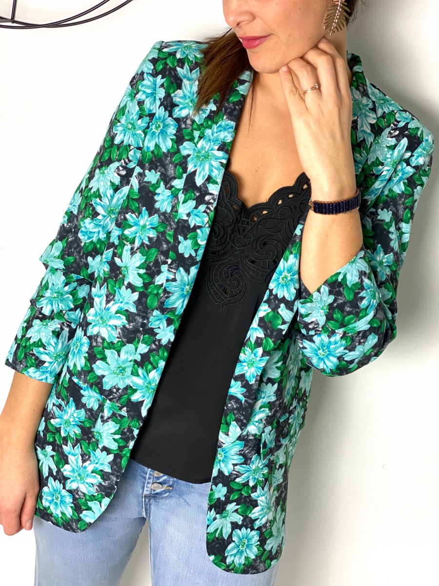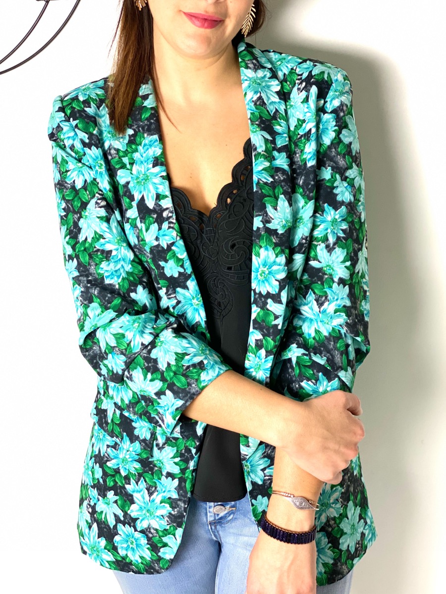Veste de blazer imprimé frais et coloré tons verts, noir et blanc.